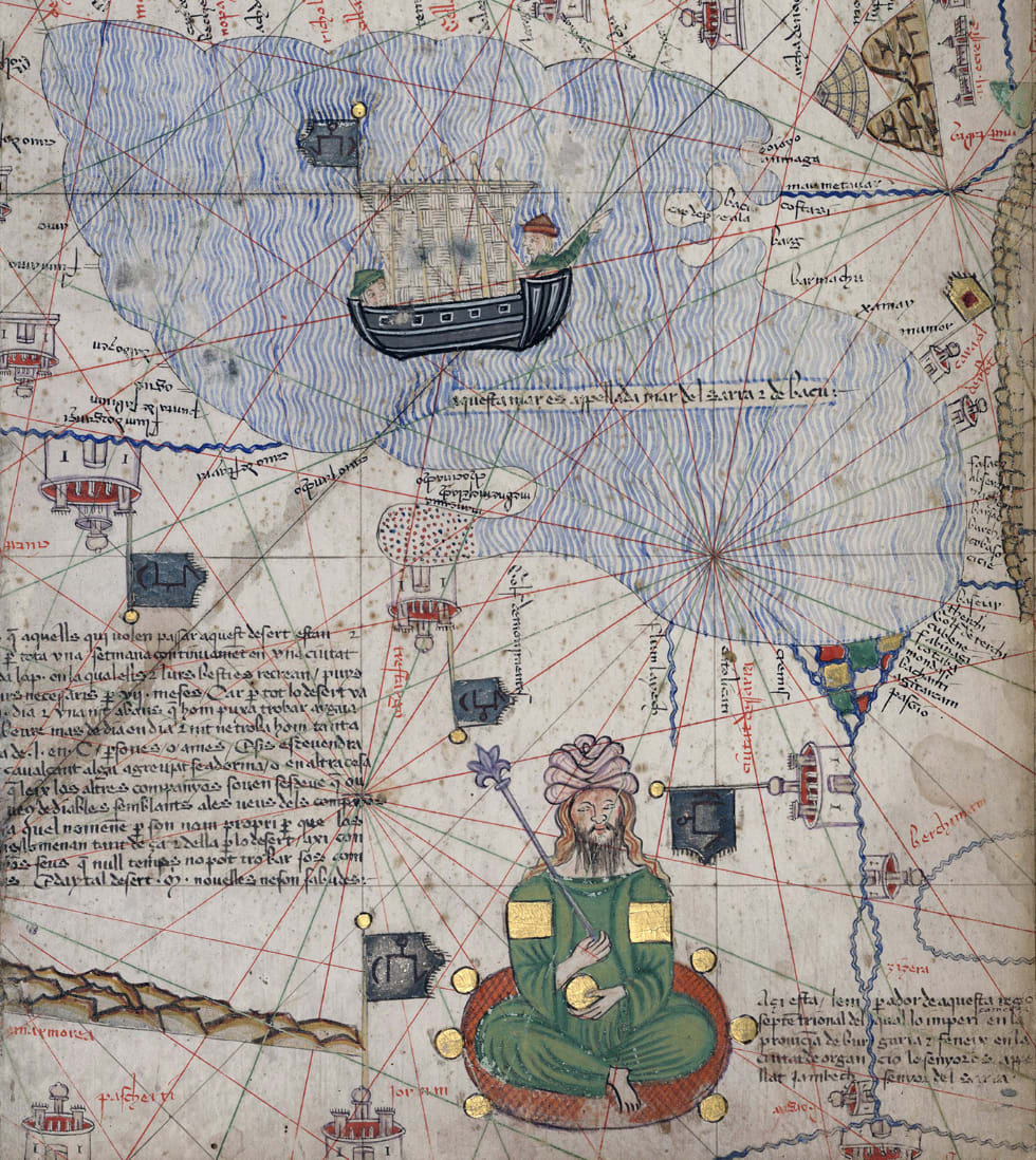 As we pan further south into Africa, we find a more fully-realized version of life there than we usually get from medieval European maps. In West Africa, we see various cities, illustrated with depictions of the people who lived there. A nomadic trader crosses the Sahara on a camel, and one of the few recognizable individuals on this map sits on his throne: Mansa Musa, the immensely wealthy king of Mali (who had died about 40 years before this map was made). The text to his right reads (this and all other inscription translations come from the very useful Cresques Project website):