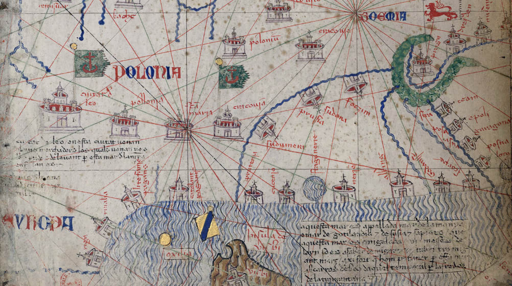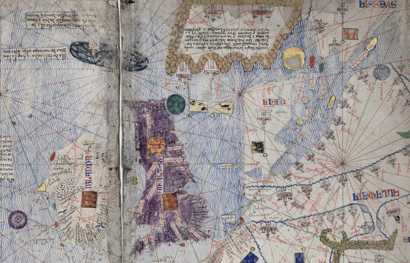 The Catalan Atlas was an attempt to combine the two types of maps that were most common in the medieval world. Navigators used the portolan, a practical nautical chart, to find distances between destinations. This one, from the early 1300s, shows the Mediterranean: