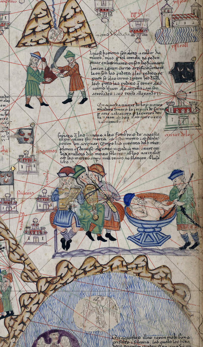At the easternmost points on the map, Cresques gives us “savage” people who eat raw fish and go naked along with “the last island of Orient. The island is inhabited by people that are very different from the rest; there are burly men in some mountains of this island, twelve-cubit in height, like giants; they are very black and dim-witted; they eat white men and foreigners should they be apprehended. In this island, there are two summers and three winters and trees and herbs flower twice a year.” Note the mermaid at the bottom left!