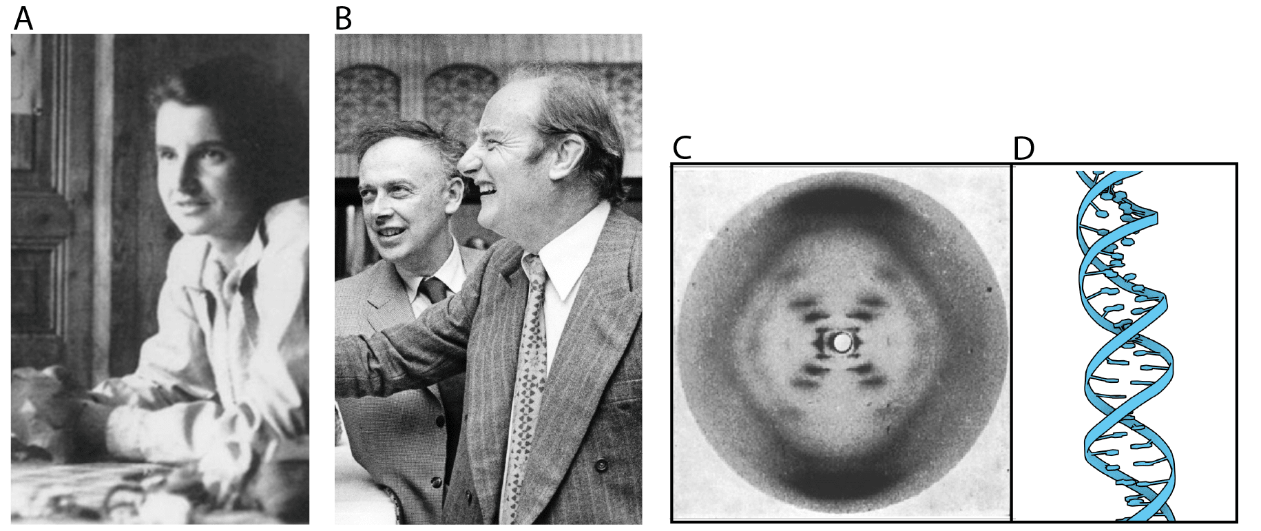 The year 1953 was the birth of a new era. The landmark event was when Francis Crick and James Watson determined the double-helix structure of DNA (Figure 2). Crick had trained as a physicist and, inspired by Schrodinger’s work, was one of those individuals who jumped ship to biology. To determine the structure, Watson and Crick used the X-ray crystallography data of Maurice Wilkins, Rosalind Franklin, and Raymond Gosling. It was a spectacular achievement due in large part to Franklin’s expertise in crystallography. To give you an idea, even a short piece of DNA, say 10 letters long (and there is more on what we mean by letters in a moment), contains between 500 and 600 atoms!
