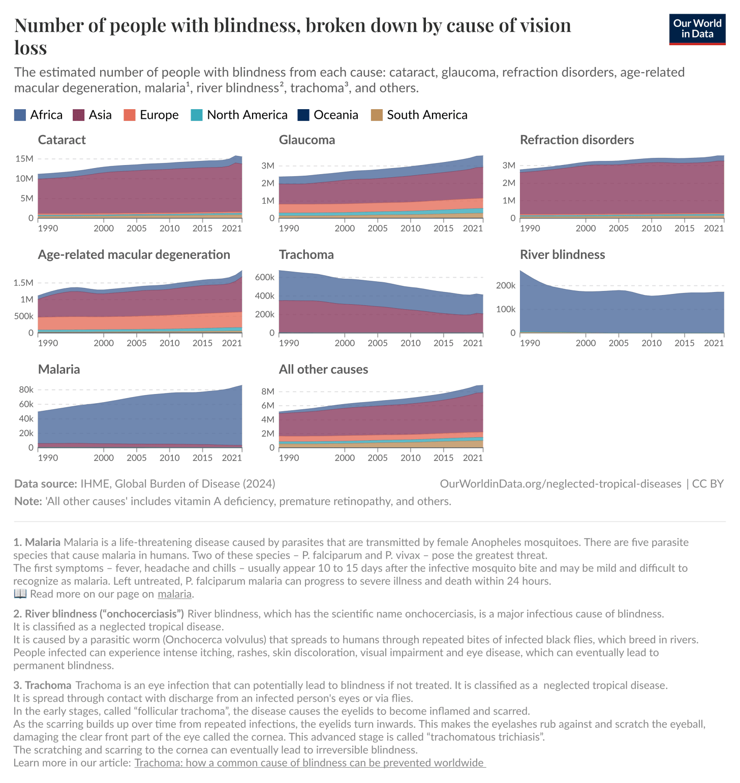 And such disorders are rampant: In 2020, an estimated 596 million people had distance vision impairment worldwide, of whom 43 million were blind. While the cause for blindness varies — cataracts (17.01 million cases), glaucoma (3.61 million cases), trachoma (1.9 million cases), age-related degeneration (1.85 million cases), and more — these diseases have enormous implications for health and economic development when taken together. Some of these problems, like age-related macular degeneration, remain difficult to treat, but others, such as cataracts, have ready and cost-effective interventions.