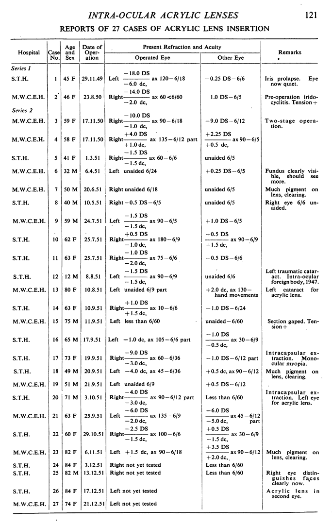 In July 1951, Ridley presented his work on IOLs at the Oxford Ophthalmological Congress, held at the School of Geology (with rooms at Frewin Hall for “lady ophthalmologists”). Though Ridley presented his results sooner than he would have liked, he had by that time performed IOL implantation in eight patients. He brought two of his most successful patients along as evidence of his triumph, one with vision restored to 20/20 (considered the normal standard) and the other achieving 20/15, even better.