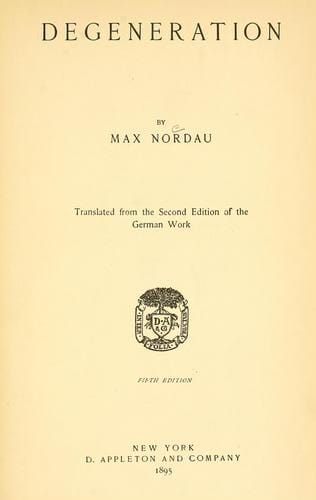 According to these writers, weakness was infecting Europe, morals were dying, and the future would bring collapse if uncorrected. These were the conclusions of Jewish-Hungarian writer Max Nordau’s book Degeneration (1892), which was one of the first texts to describe neurosis. Nervousness, exhaustion, hysteria, egotism, and the inability to act were some of its many symptoms. City life and its decadence had corroded the mind, Nordau argued, and the whole of society needed to be treated like the sick patient it was. It was the decline of “masculine vigor” that had allowed traditions to weaken: men were being “feminized” and women were increasingly becoming “mannish.” This process if left on its own, he predicted, would lead to the “dusk of nations.”