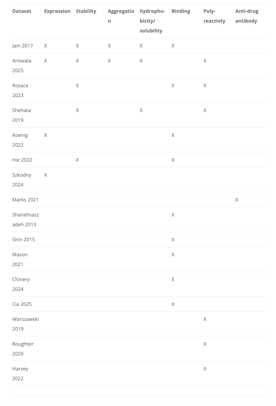 What else is there? To name a few: expression, stability, solubility, immunogenicity, receptor promiscuity, manufacturability, and PK/PD. There are plenty of models for optimizing each of these properties one-at-a-time, but creating something that can jointly optimize all these at once is a taller order. A great recent blog post from the Oxford Protein Informatics group discussed this a little, and you can see the inklings of open-sourced, multi-objective datasets here coming together, but it is still extremely early and limited in size (almost always <1000 antibodies for non-binding datasets).