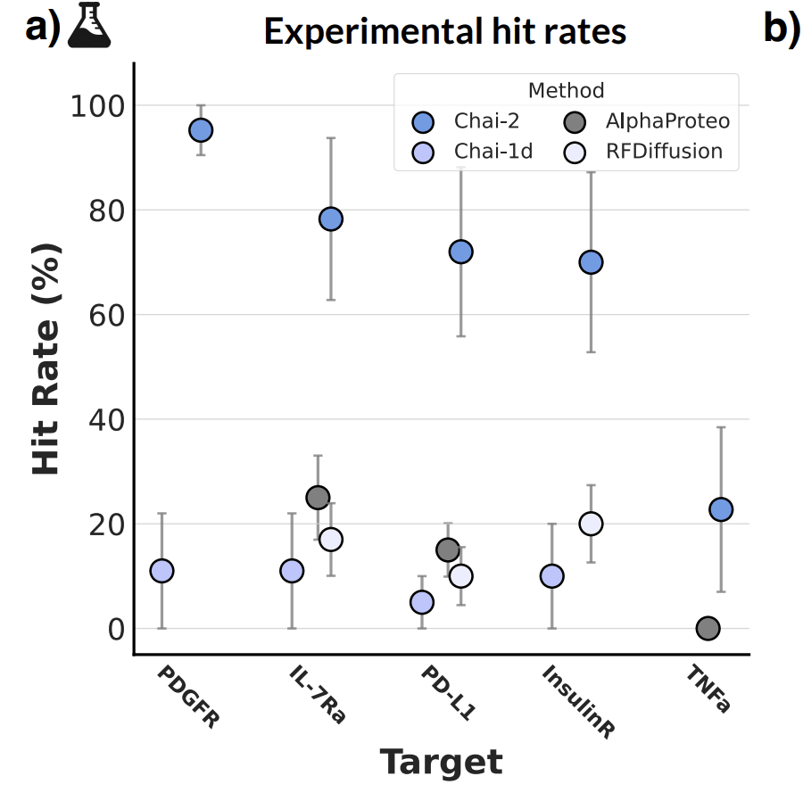 Let’s consider Chai-2’s results from July 2025 as a decent view into how much better the private models are than one open-sourced one—RFDiffusion—for the task of miniprotein design. The results are hindered by a bit due to the fact that the best open-source miniprotein design model—Bindcraft—is not included here. But whatever, let’s pretend RFDiffusion is as good as open-source gets.