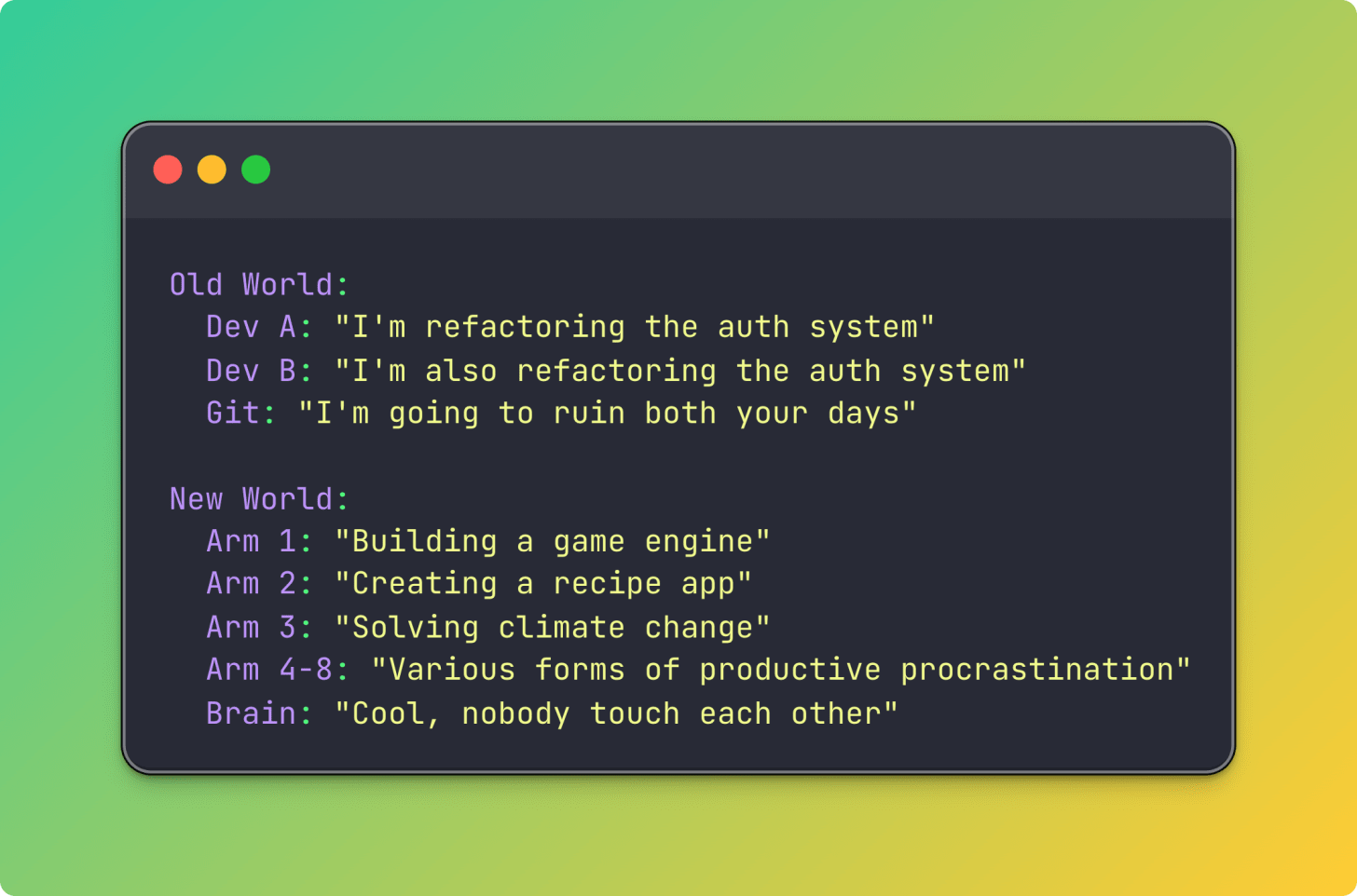 Two developers on one codebase is like two octopuses sharing one coral reef. Technically possible. Practically ridiculous. Everybody's arms getting tangled. Ink everywhere. The coral is screaming (coral doesn't scream, but work with me here).