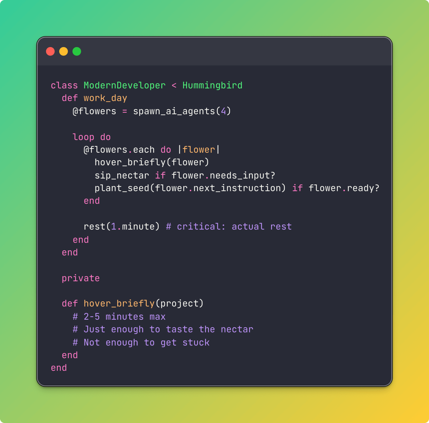 The hummingbird doesn't live at any flower. It visits. Sips. Moves on. The flowers do the work of being flowers—growing, blooming, making nectar. The bird just... coordinates. Pollinates. Enables.