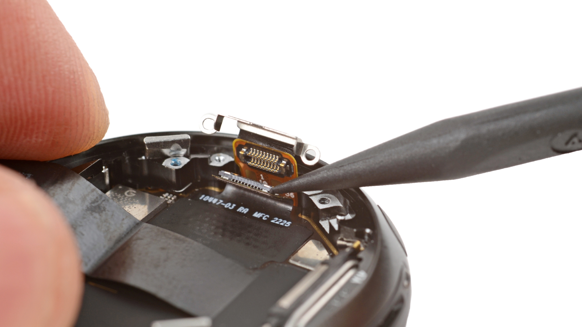 Under the backplate sits a vibration motor that ditches fragile flex cables for sturdy pogo pin contacts. It’s secured with screws, two of which also hold down the battery bracket. That’s a neat bit of screw efficiency we appreciate.