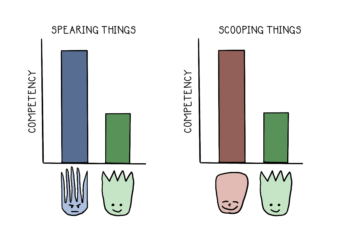 Despite the additive operation, the result is more like subtraction: 3 + 2 = 1. A spork is worse than a fork at spearing things and worse than a spoon at scooping things. With this double mediocrity, it’s a wonder how portmanteaus exist.