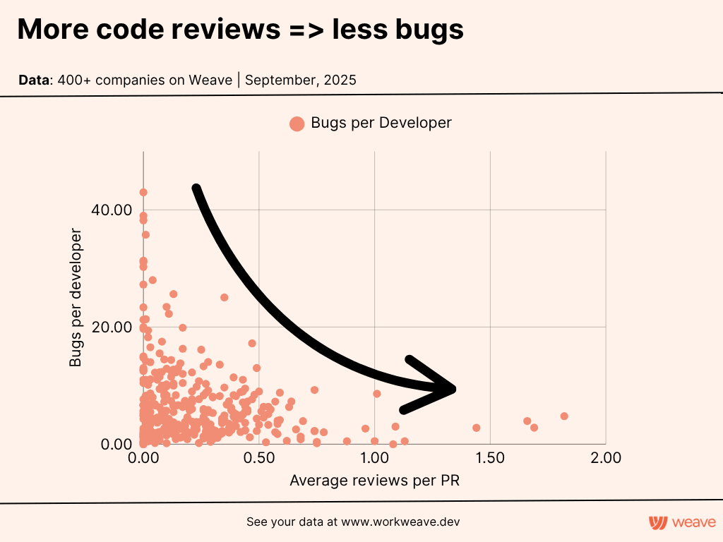 The biggest gains happen between 0 and 0.5 reviews per PR - after that, diminishing returns kick in.
