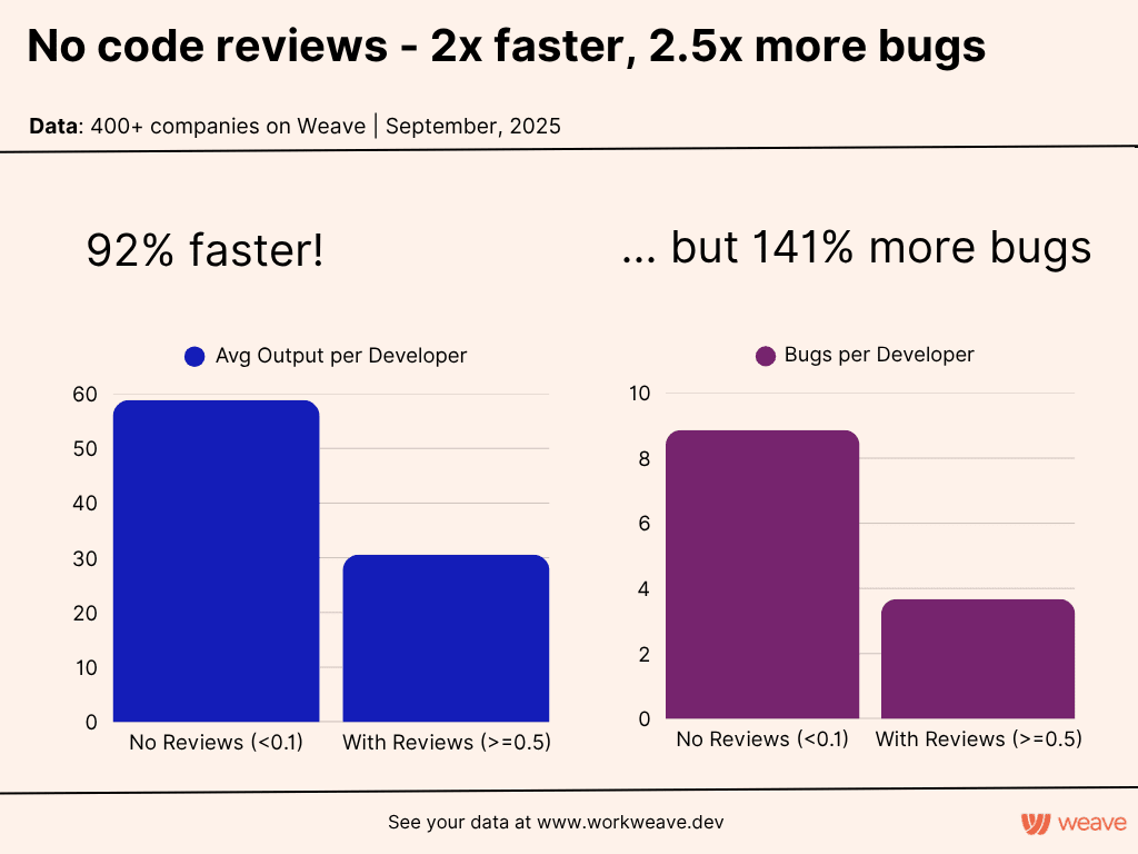 Even accounting for higher productivity, that’s 25% more bugs per expert hour of work. So yes, skipping reviews makes you faster. But you’re also shipping significantly buggier code.