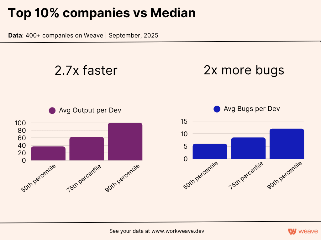Here’s the surprising part: the best teams ship fast AND maintain quality. Top 10% teams are 2.7x faster while keeping bugs per feature 33% lower: