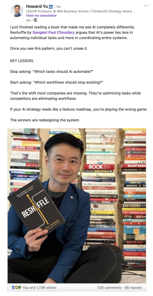 In talking about Reshuffle in a post that went viral on LinkedIn last week, Howard Yu makes a similar point about the book’s central message: