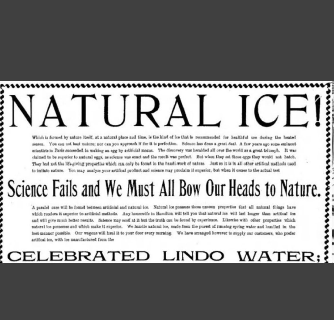 In his book How We Got to Now, Steven Johnson explains how the ice industry—which coined the term “artificial ice”—spread rumors about the new invention, even claiming it could carry disease. It didn’t help that the Ferdinand Carree ammonia refrigerators were the ones that first took off. Ammonia-produced ice would leave a white residue when it melted. Ice plants could explode or have ammonia leaks, leading to calls for regulation. Natural ice manufacturers ran vicious ads, like this one from Lindon Ice that says “Science Fails And We Must All Bow Our Heads To Nature.” After all, an 1880 New Orleans newspaper article noted that there remained a “natural prejudice” in favor of natural ice. The assault in the press was so severe that Gorrie could not attract investment and died penniless, perhaps delaying progress in refrigeration by decades. As a result of lack of investment, the cost of artificial ice remained high for decades, slowing its adoption.