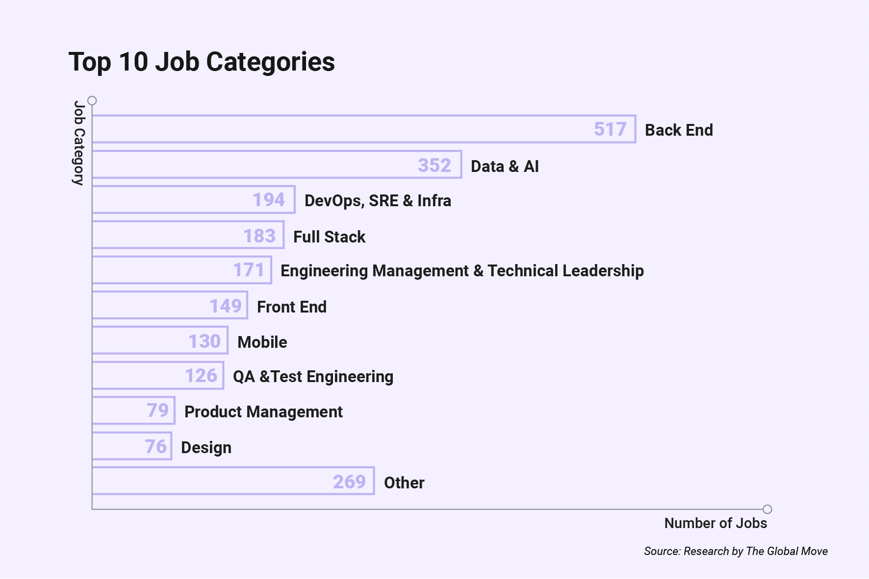 Out of the 1,500+ jobs, Back End roles topped the charts with 517 openings—more than double the next category. Even in a world dominated by AI hype, the need for solid back-end engineering is still undisputed. That’s good news for experienced engineers whose skills might not sound flashy, but whose work makes things run.