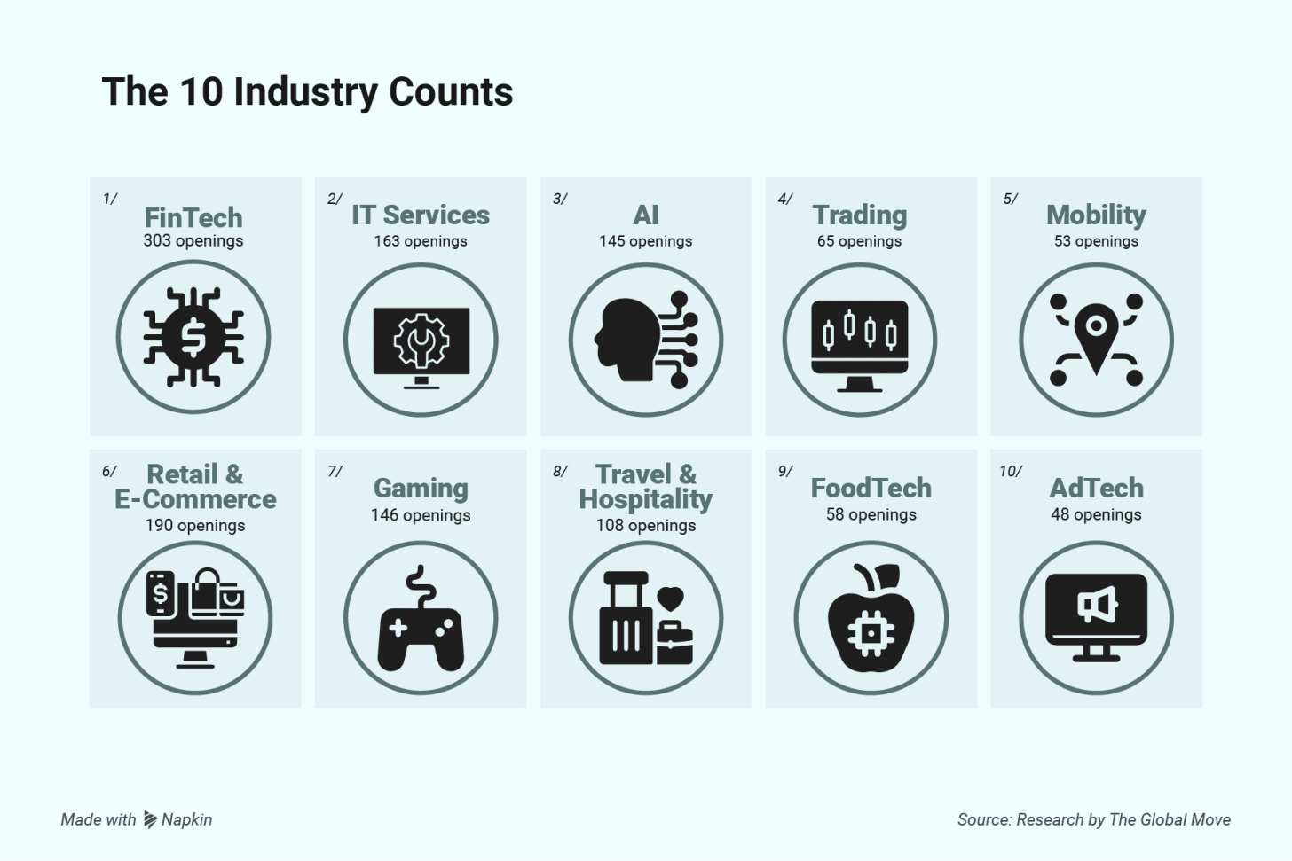 When it comes to sectors, Fintech was the clear leader with over 300 jobs listed. The next most active were E-Commerce, IT Services/Custom Software, Gaming, and AI. Yes — AI is not the top industry relocating talent.