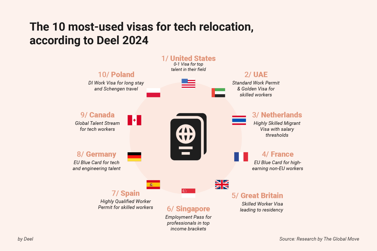Here are the top 10 most-used relocation visas globally, based on Deel’s internal hiring data: