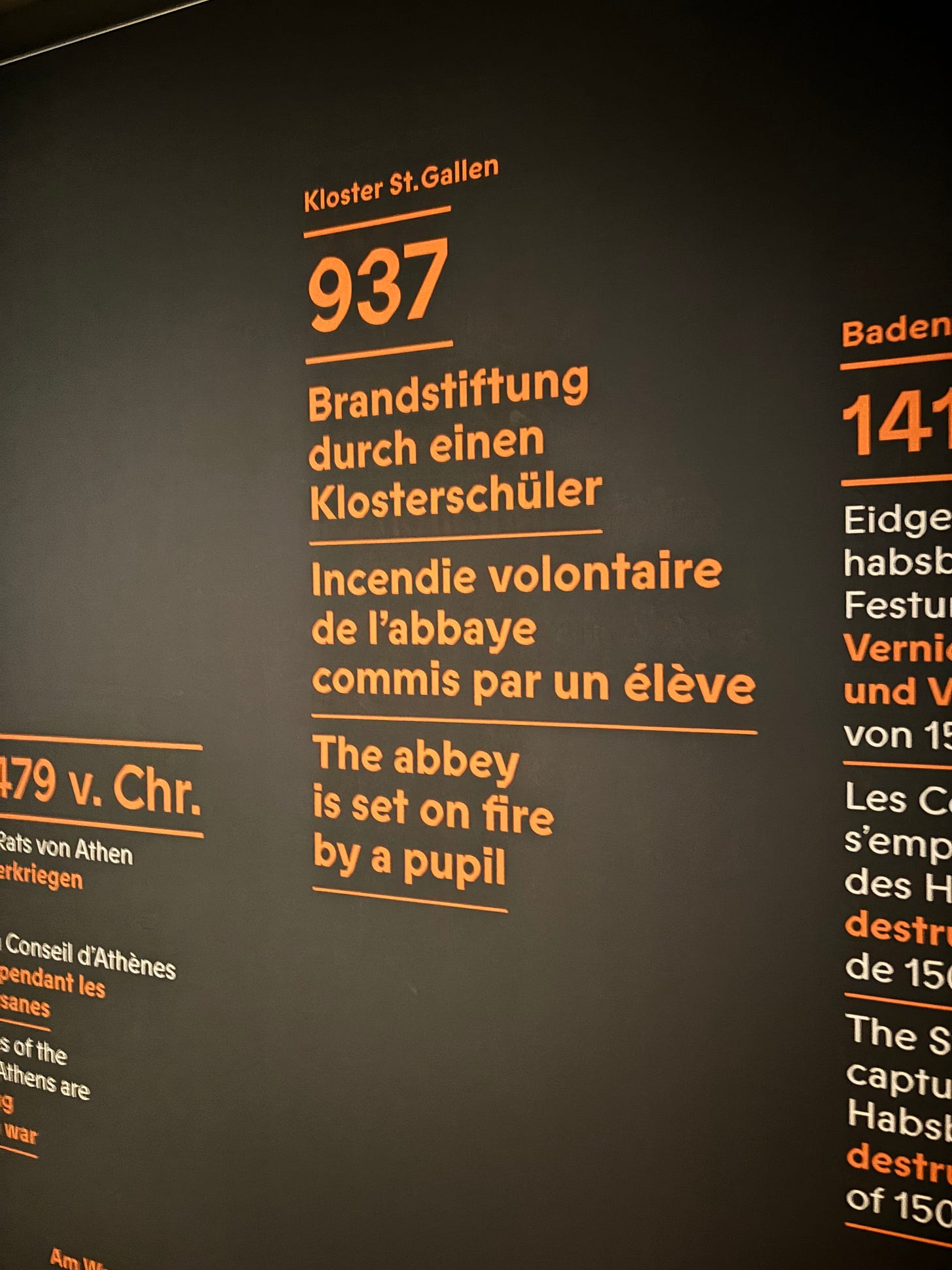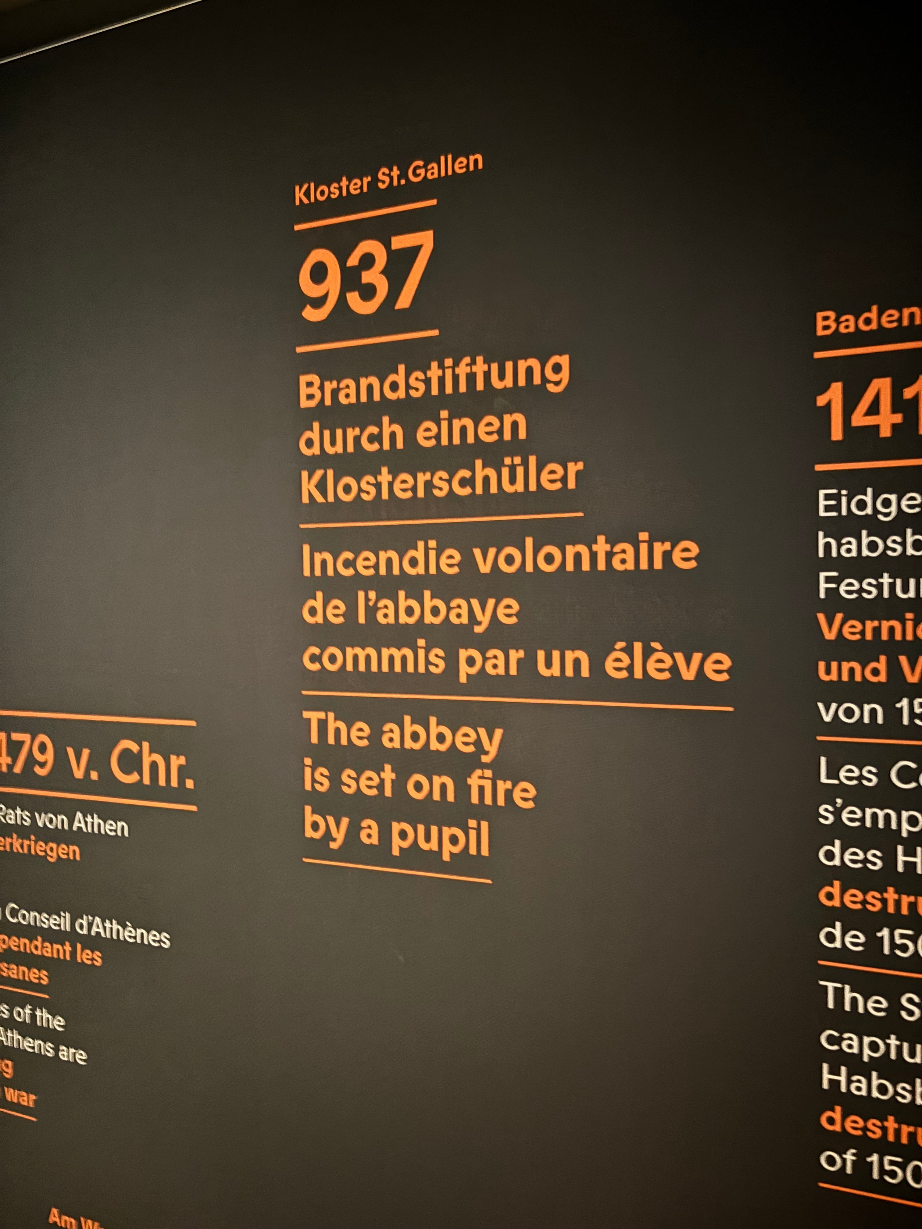 One theme of the Abbey’s museum was the periodic danger the monks faced from the abbey’s myriad geopolitical threats. The monks and librarians took considerable efforts to preserve their reservoir of knowledge from external threats — including, at times, moving the texts out of St. Gallen to other locations. They were pretty successful! The most serious threat to the abbey came from… well…