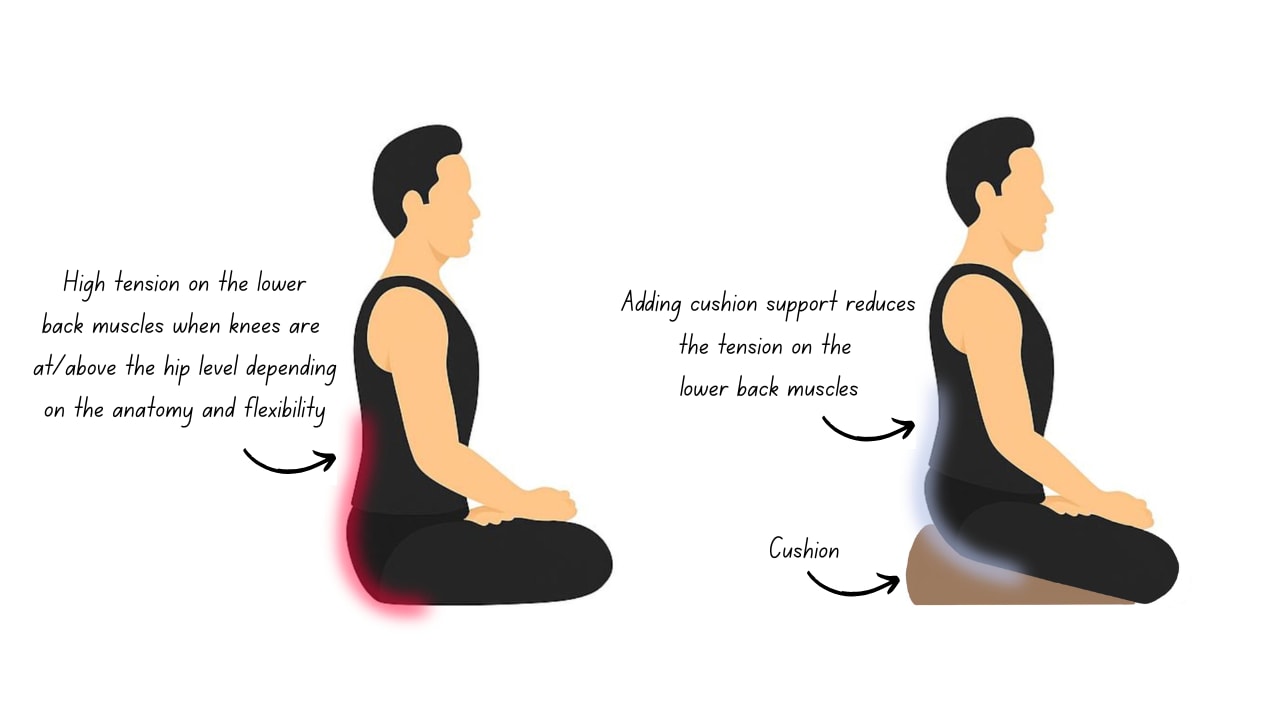 When sitting in the cross legged posture, there are different bones and muscles that are working to keep us stable in that posture namely lower back, upper back, hips, tailbone. Understanding how these bones and muscles interact to keep us upright can help us understand how to best position them for easier sitting. Depending on the individual anatomy and flexibility, the best posture can vary from person to person.