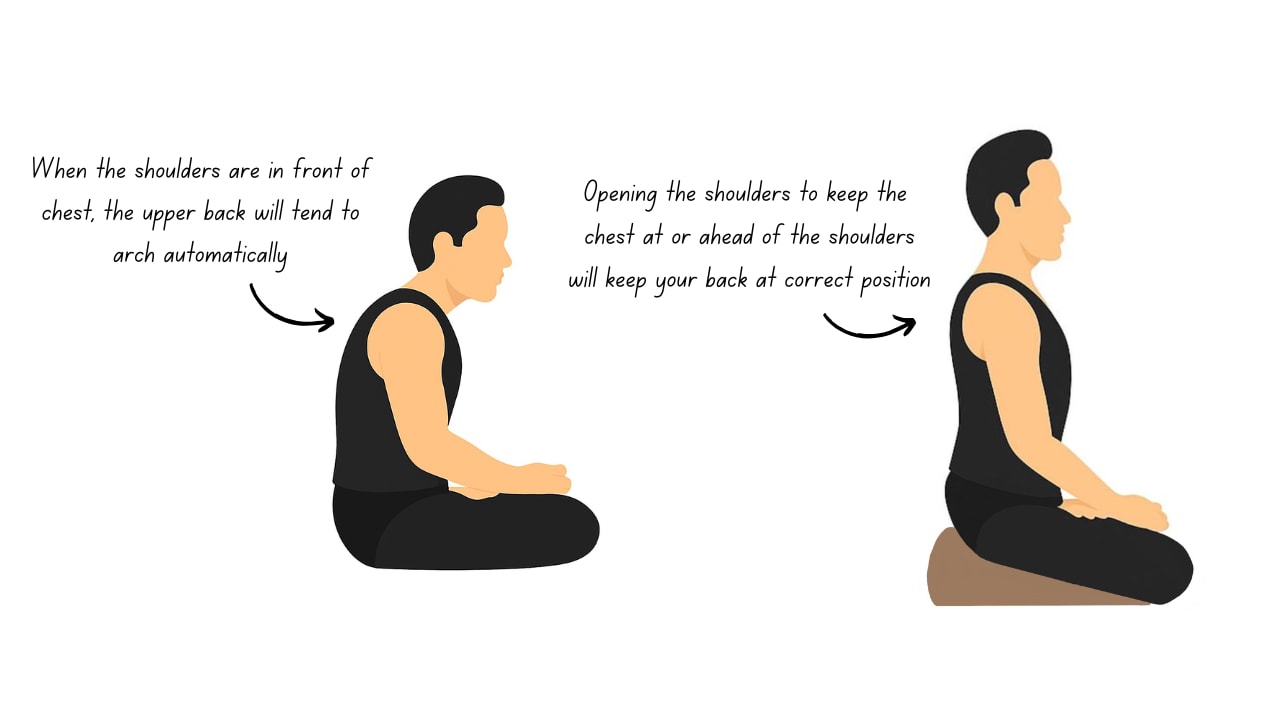This can be fixed by simply opening up the shoulders to be at the level of the chest. As you bring your chest slightly forward and move your shoulders slightly backward, the upper back and the neck position will correct itself. However, it shouldn’t be too forward that it requires effort to maintain that posture.