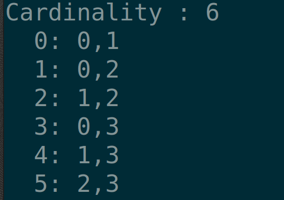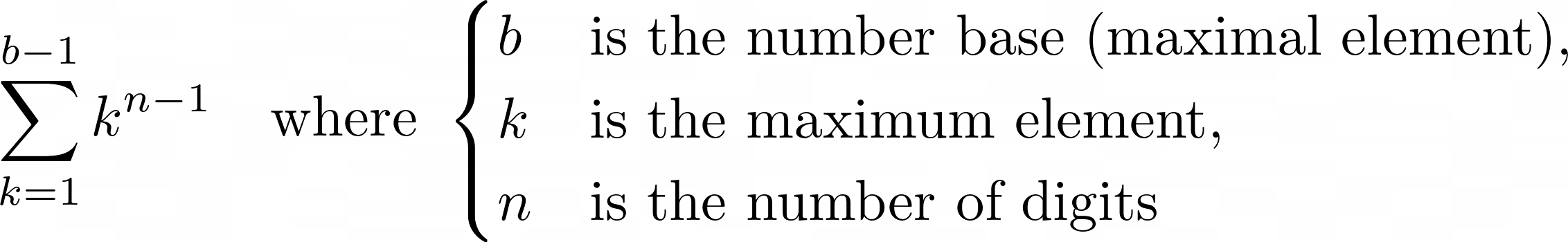 #include <stdio.h> #include <stdlib.h> #include <math.h> //clear && gcc maximum.c -lm -o m.o && ./m.o int FindCardinality(int base, int n) { int cardinality = 0; for(int k = 1; k <= base - 1; k++) { cardinality += pow(k, n-1); } return cardinality; } int main() { int base = 4; int numberOfDigits = 2; int cardinality = FindCardinality(base,numberOfDigits); printf("Cardinality : %d\n", cardinality); return 0; }If we run the code above with a base of 4 and 2 digits, we observe that our set has a cardinality of 6 elements. This can be easily verified by hand-enumeration (or bruteforce):