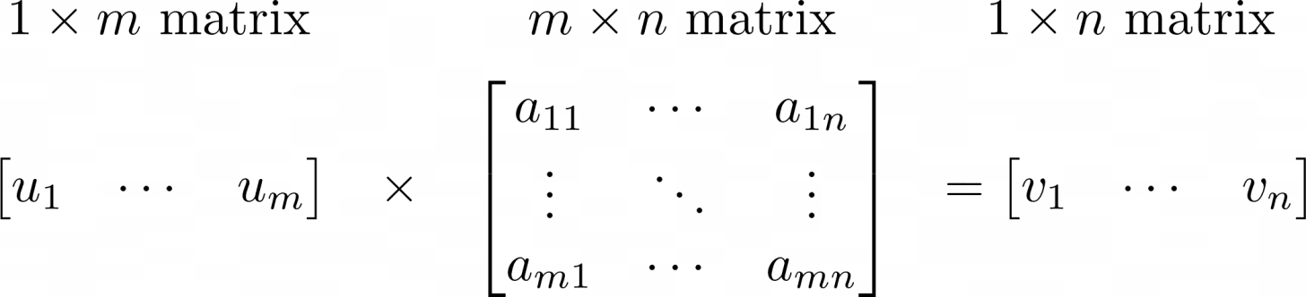 We are working with one-dimensional vectors of length n. Therefore, we establish that a 1*m vector multiplied by a m*n matrix yields a 1*n vector.