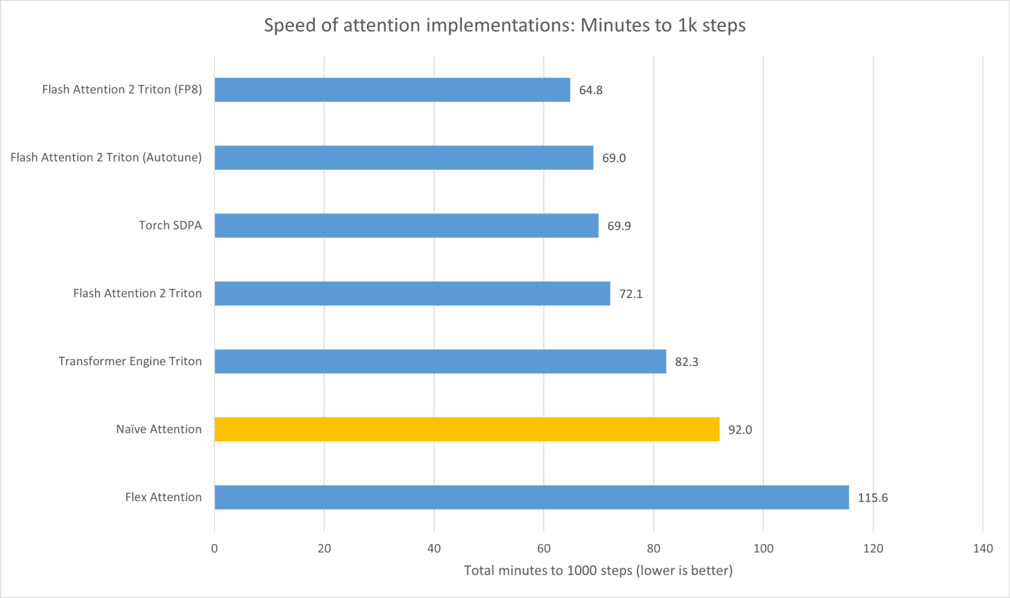 Now, let’s tackle the speed tests: as I’ve said before, all runs are for 1000 steps. Naive attention, for your visual aid, is in yellow.