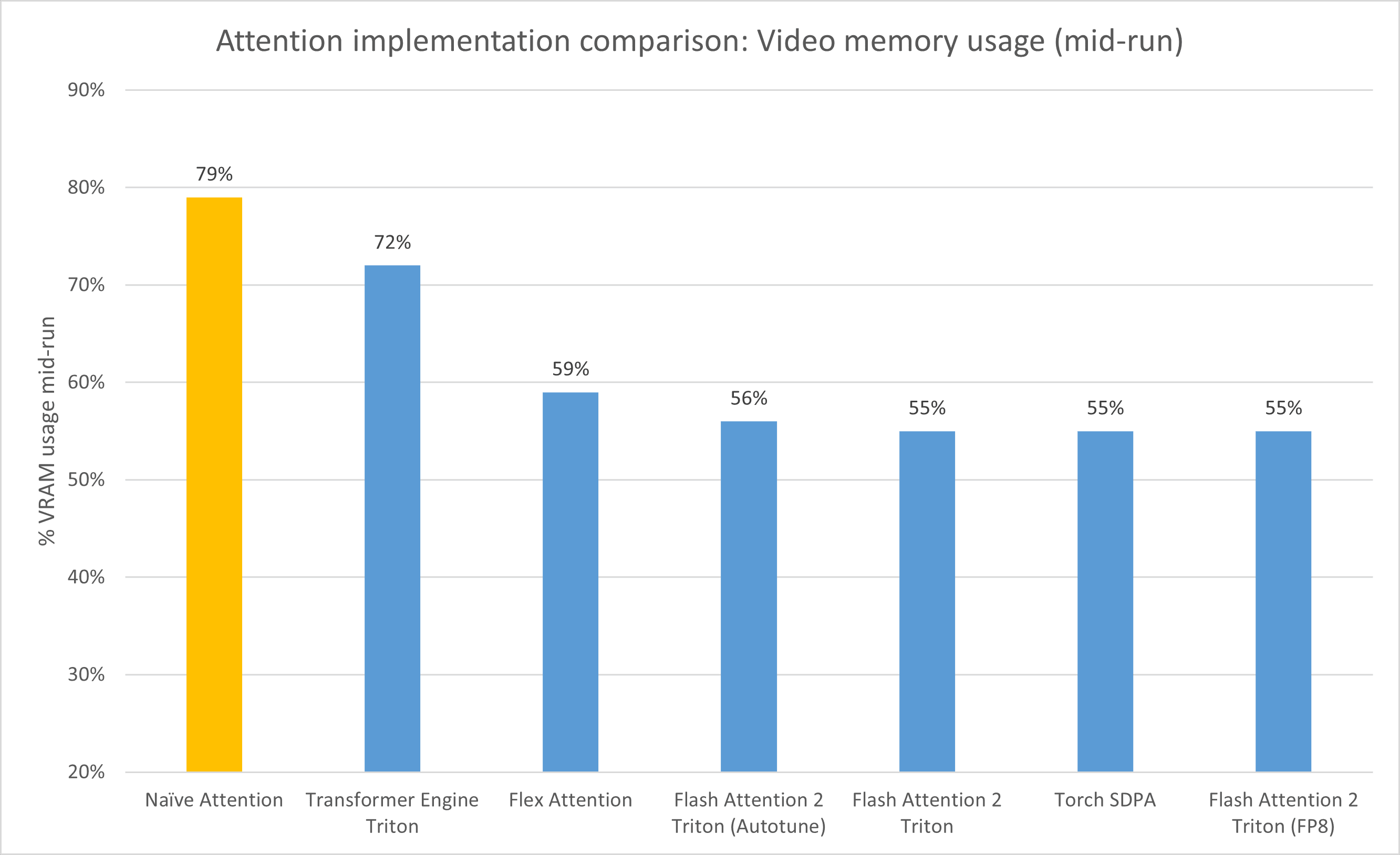 As expected, the naive approach takes up the most, followed by the anemic Transformer Engine and Flex, then the rest are roughly equal, with modest 24% VRAM savings at just 64 batch size and 1024 block size, I’m sure it’d be more pronounced at longer contexts.