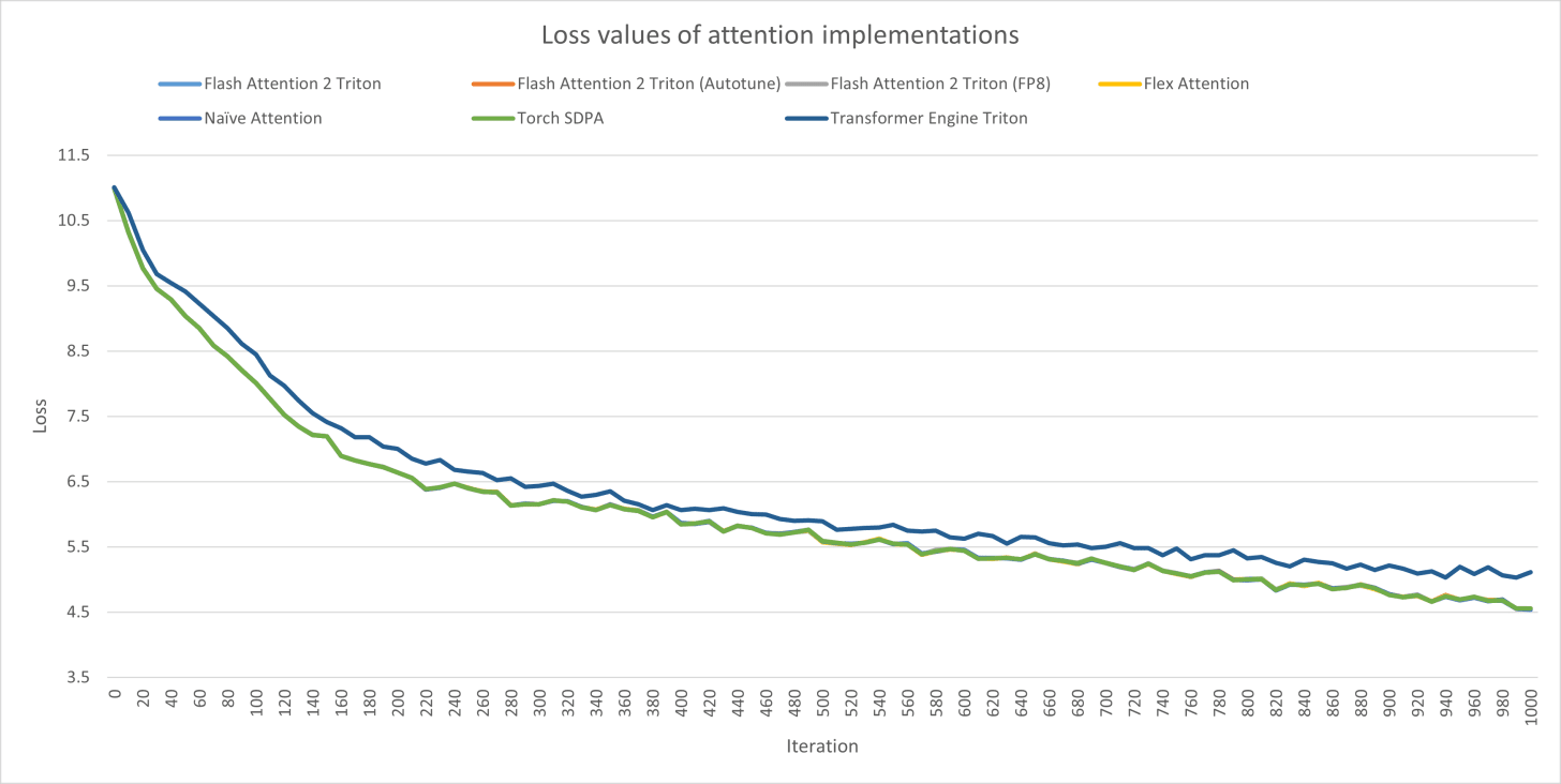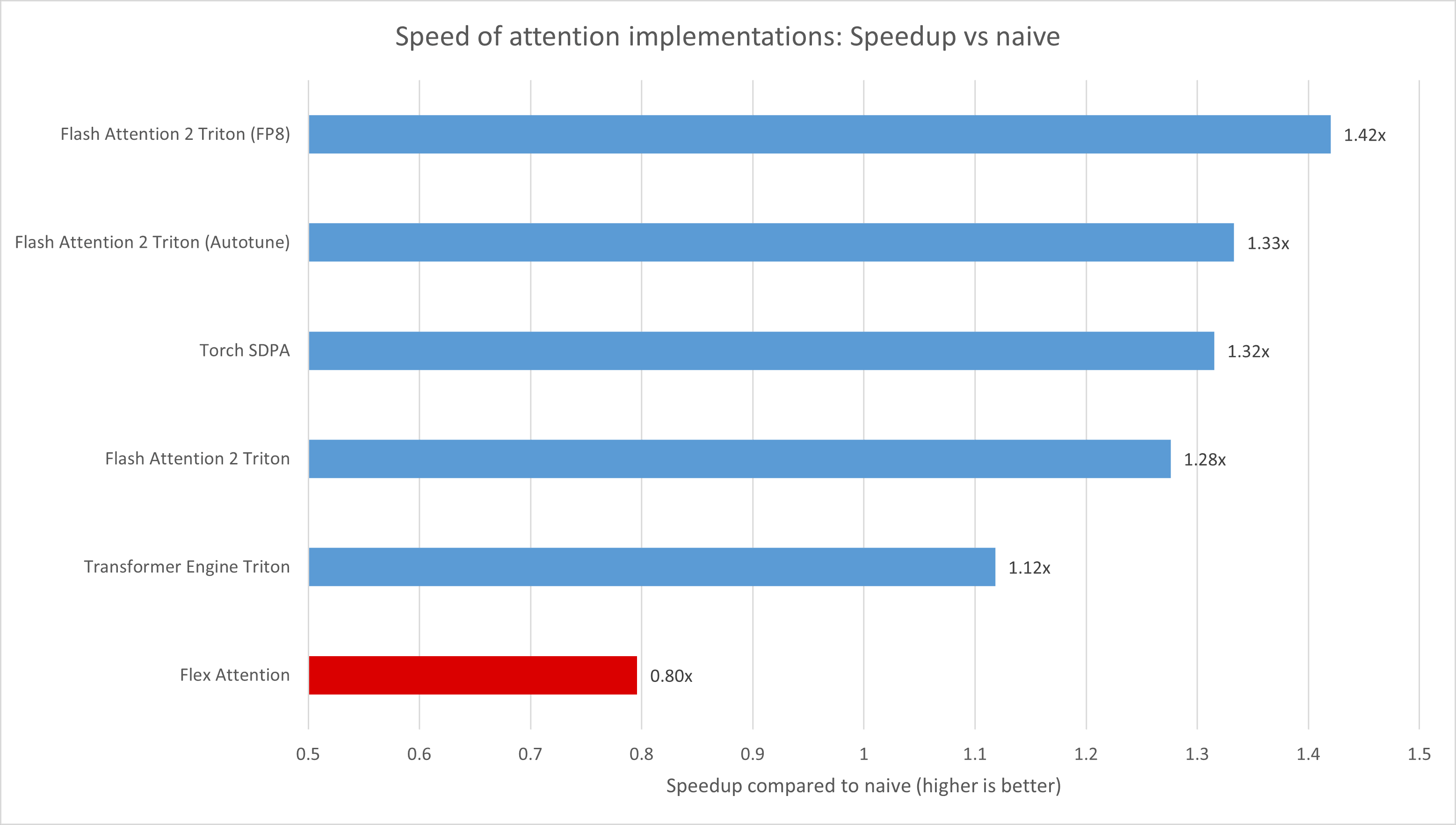 As you can see, the fastest is Flash Attention 2 Triton with FP8, with Torch SDPA slightly beating Flash Attention 2 Triton without autotune, but being beaten with, and Transformer Engine Triton providing only a small speedup (which is more than canceled out by the increase in loss), but Flex Attention actually being slower than a naive approach! That makes FlexAttention unusable.