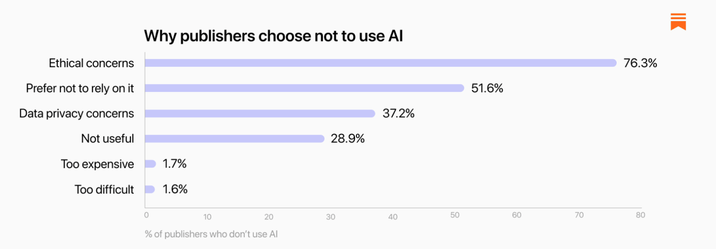 Ethical concerns were also a priority for the 52% of the surveyed publishers who do not use AI tools: over three-quarters of them cited such concerns as a reason why they choose not to use AI.