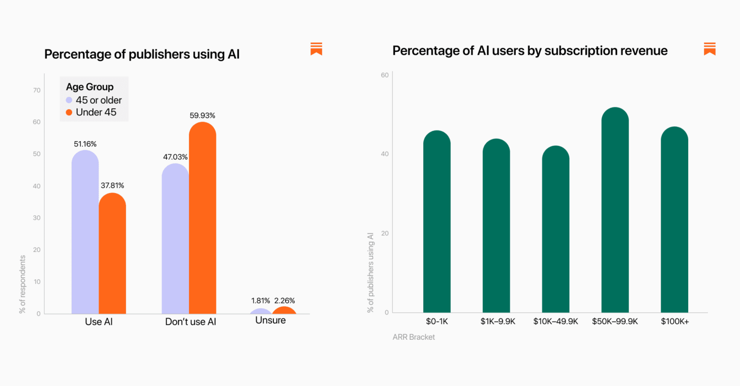 Based on our results, a typical AI-using publisher is 45 or over, more likely to be a man, and tends to publish in categories like Technology and Business. He’s not using AI to generate full posts or images. Instead, he’s leaning on it for productivity, research, and to proofread his writing. Most who use AI do so daily or weekly and have been doing so for over six months.