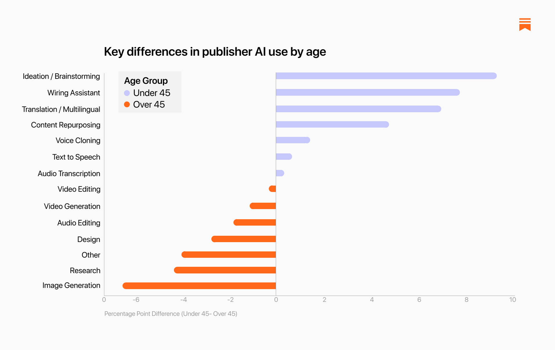 Respondents under 45 were more likely to rely on AI for translation. Younger publishers also said they were more likely to use AI for ideation and writing help than the older cohort. Those 45 and over work more with AI for research and image generation. Audio- and video-related use cases show little variation by age.