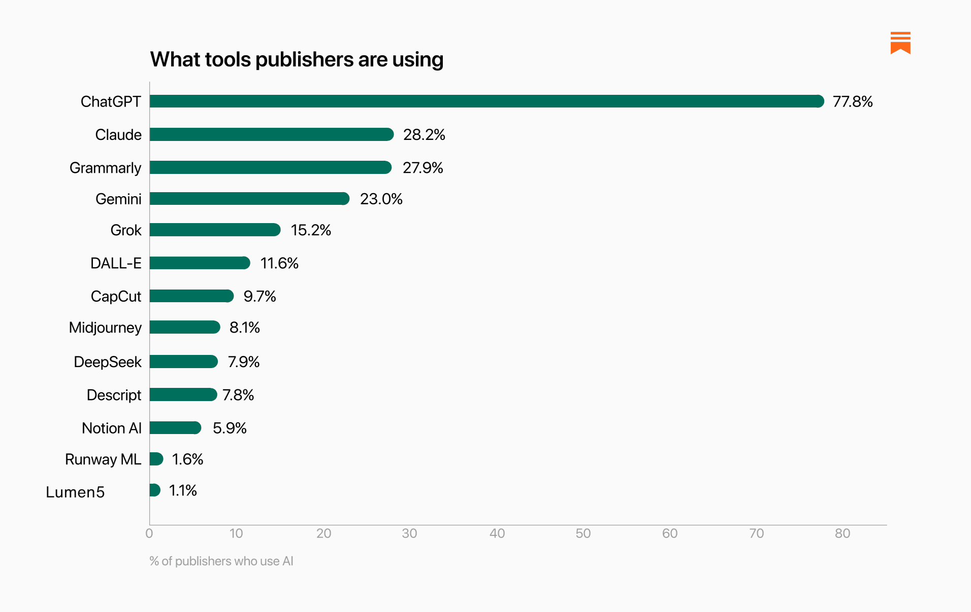 ChatGPT’s first-mover advantage still shows. Nearly 8 in 10 AI-using publishers report using it, far more than any other tool. Usage drops off from there, with Claude (28.2%) and Grammarly (27.9%) as the next most commonly used. Image and video generation tools like Midjourney (8.1%), Runway ML (1.6%), and Lumen5 (1.1%) remain relatively niche.