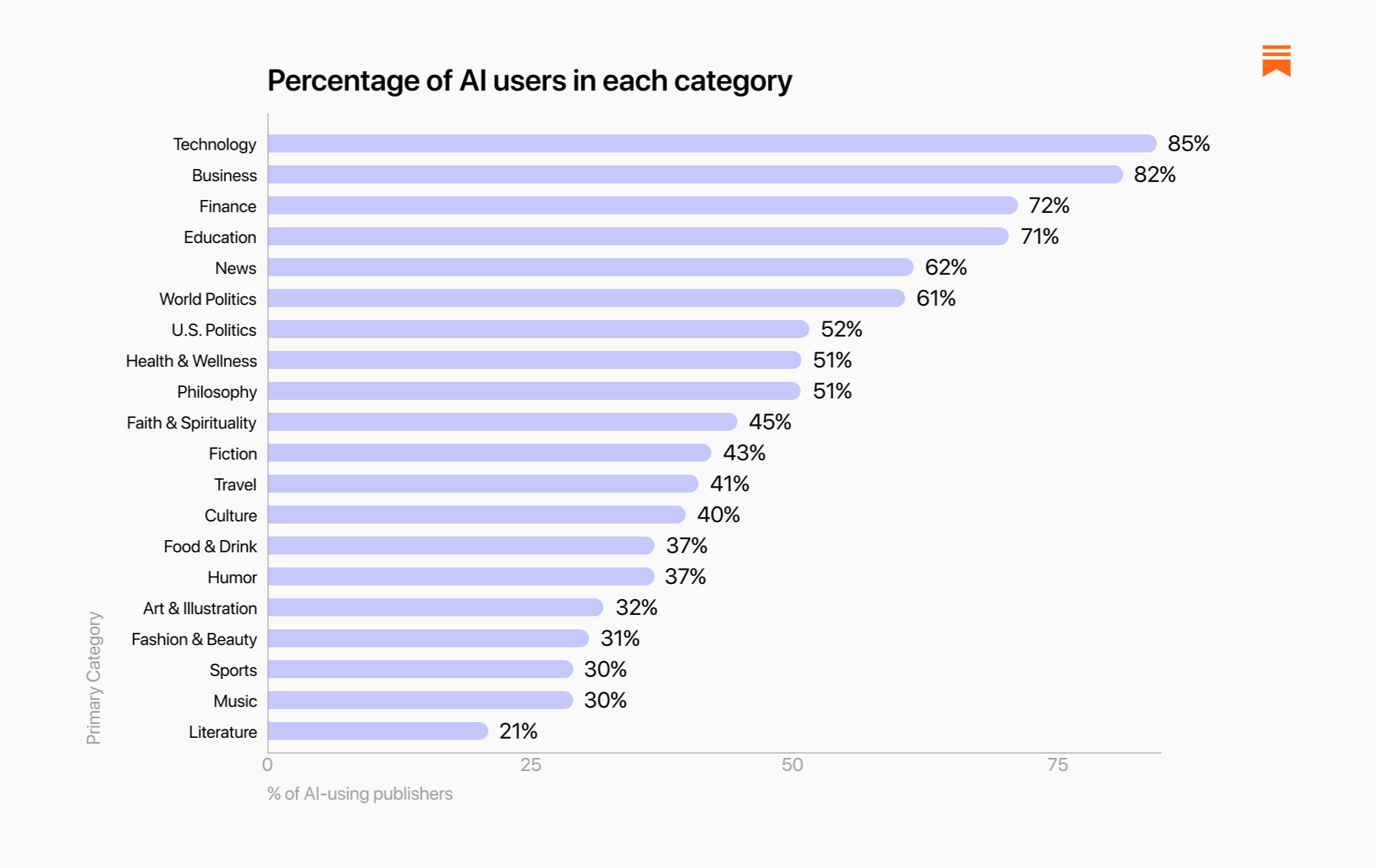 In the responses, AI adoption varied widely across publishing categories. Technology, Business, and Finance had the highest rates of adoption, while Literature, Music, and Art had some of the lowest. A 64-point spread between the Technology and Literature categories marks the widest divide in the responses.