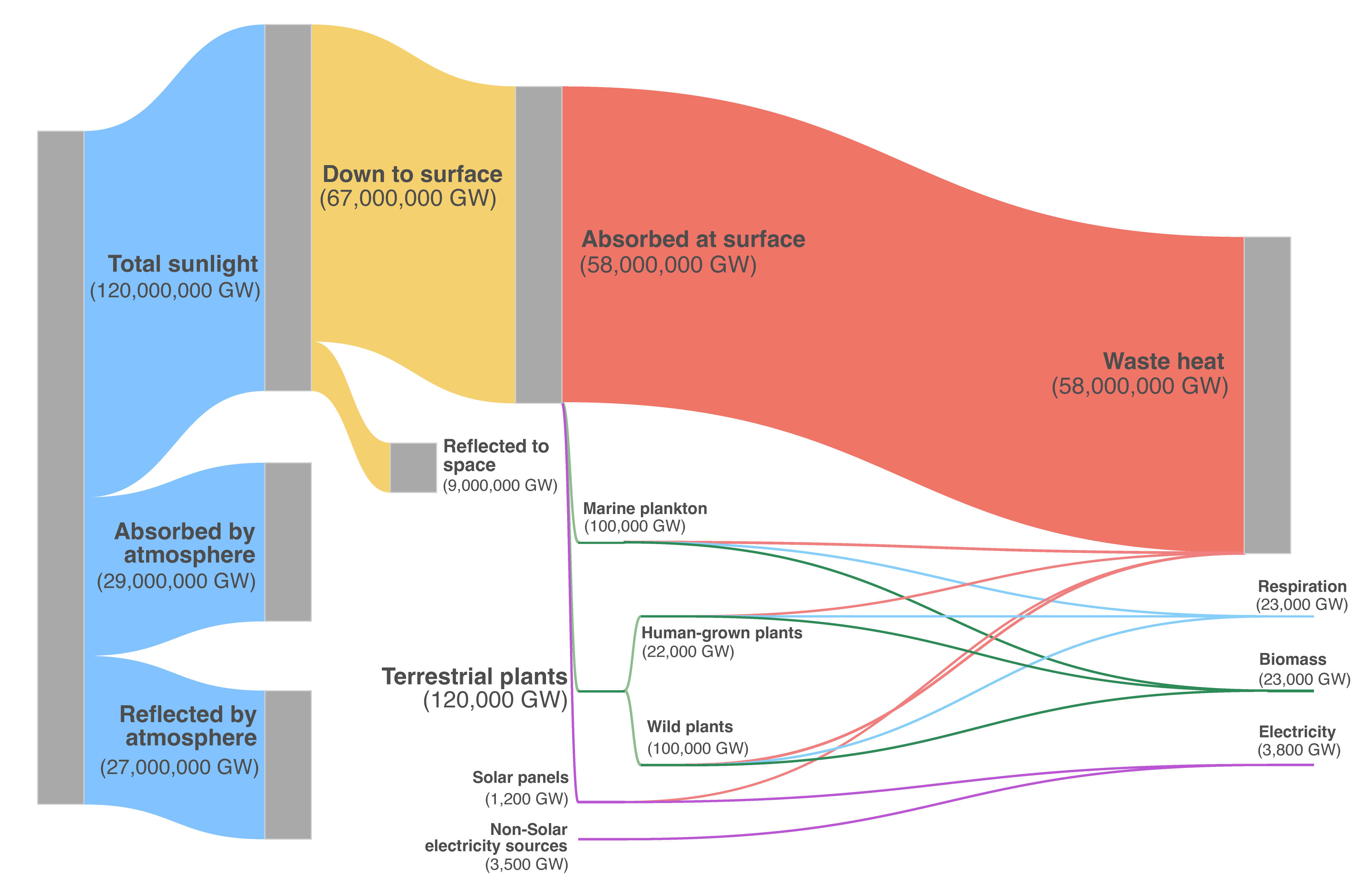 To keep this number in perspective, though, all of the solar panels, lumber forests, grazing lands, crop fields, wild plants, and oceanic phytoplankton combined only account for about 0.5 percent of all the sunlight absorbed at the Earth’s surface. Both nature and humanity have only just begun tapping into the awesome potential of sunlight.