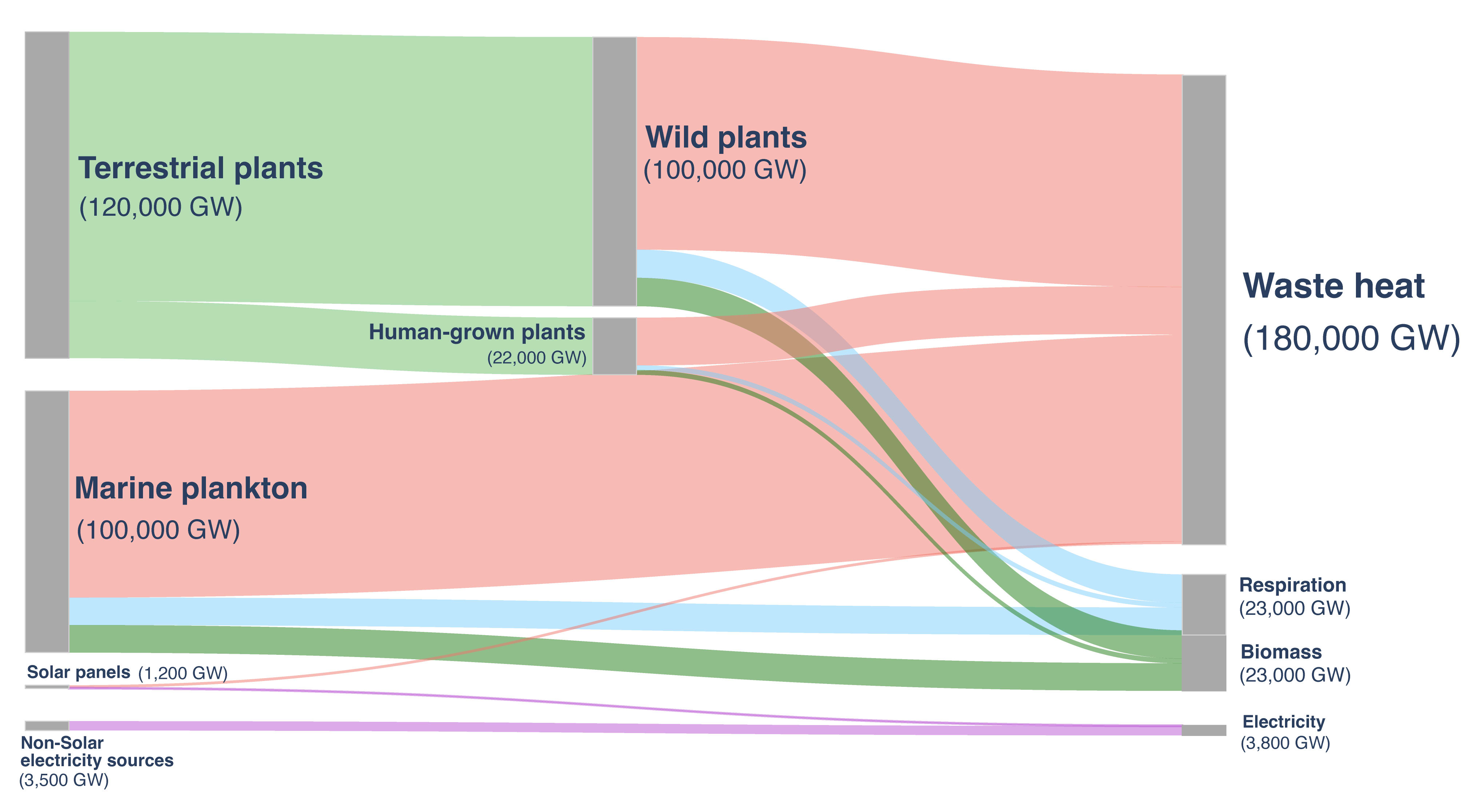Solar power generation is relatively easy to account for. The Energy Institute’s 2025 Statistical Review of World Energy estimates that humanity’s solar industry currently soaks up sunlight at a rate of approximately 1,200 gigawatts (GW), of which about 240 GW is usefully converted to electricity. If we were to expand our solar capacity to match current global electricity demand at the same conversion efficiency, that absorption would balloon to about 18,000 GW.
