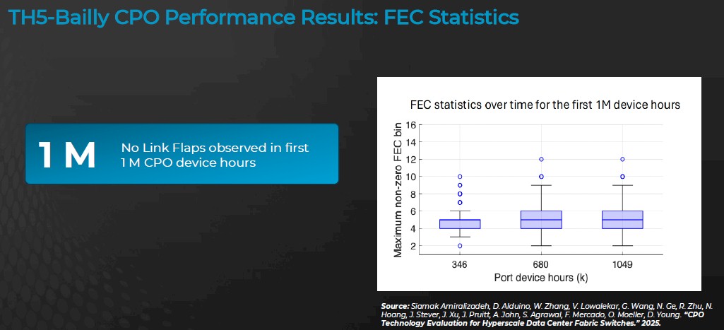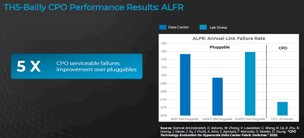 The pluggable optics use actual datacenter failure rates, while the CPO is using lab stress failure rates because Meta Platforms did not see any failure rates in its datacenter test. And by the way, Mehta says that the lab conditions where the Bailly CPO was tested were much harsher than the environment in the Meta Platforms datacenters because the lab is explicitly trying to cause failures, not to avoid them, by being too hot or vibrating a lot.