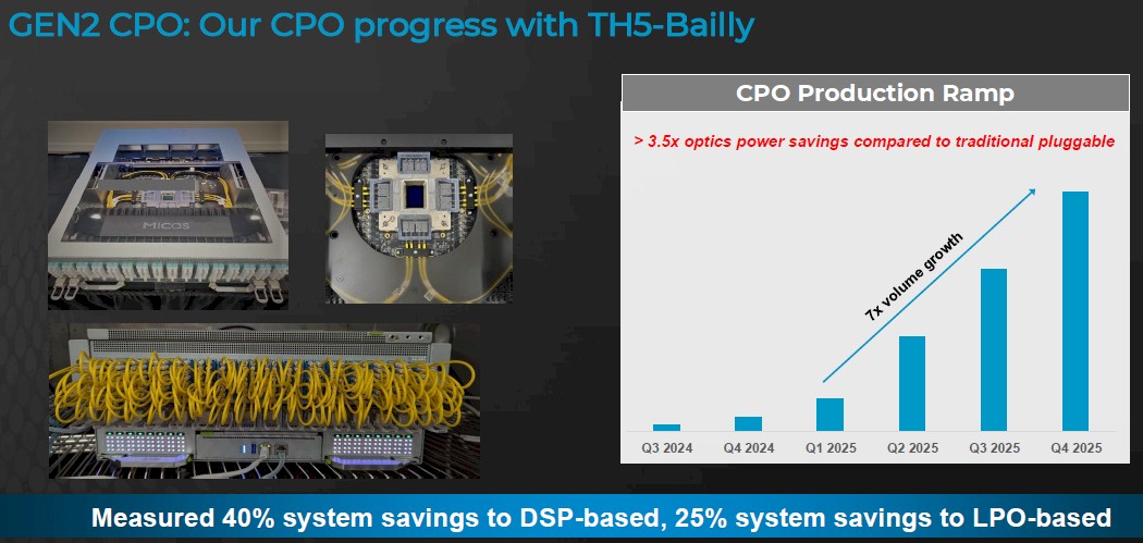 What we hope, however, is that Broadcom makes a CPO version of its Tomahawk Ultra “InfiniBand Killer” switch ASIC, which was announced in July and which is being positioned as the Ethernet for scale up networks for sharing XPU memories in rackscale nodes used in AI clusters. We think it would be very interesting to see CPO ports on accelerators matched to CPO ports on switch chips, as we have pointed out time and again. It is OK to start with the scale out network, but ultimately, we need such links everywhere, even for memory banks and flash banks, so we can have more options to connect components and to save power.