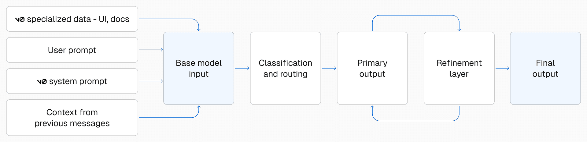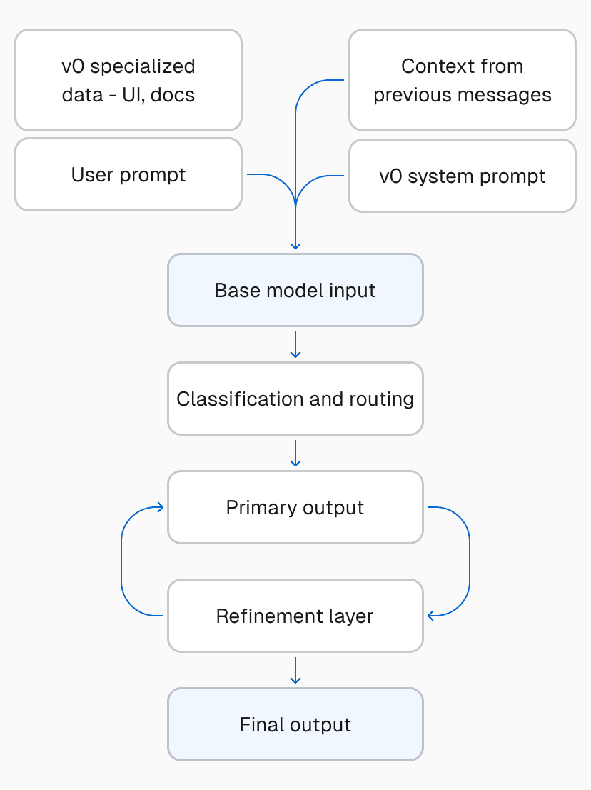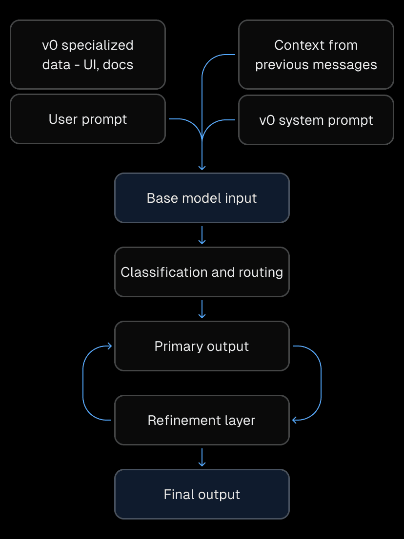 While this may sound complex, it enables v0 to achieve significantly higher quality when generating code. Further, as base models improve, we can quickly upgrade to the latest frontier model while keeping the rest of the architecture stable.