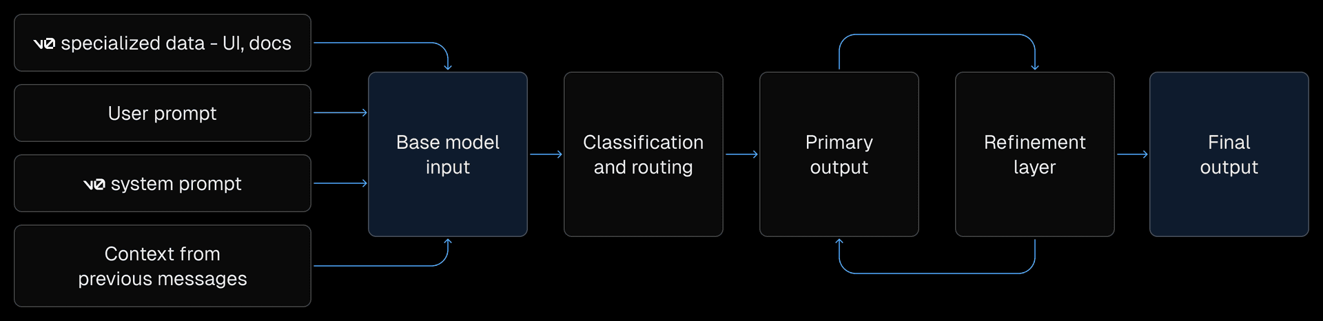 Because of v0’s composite architecture, base models can be updated or replaced as new models become available without needing to rebuild the entire model pipeline. For example, v0-1.0-md currently uses Anthropic's Sonnet 3.7 while v0-1.5-md uses Sonnet 4. The composite model architecture allowed us to upgrade the base model while keeping the rest of the stack stable.