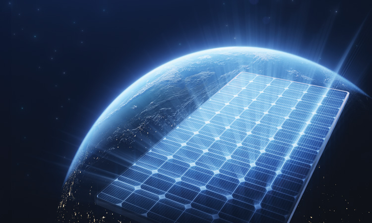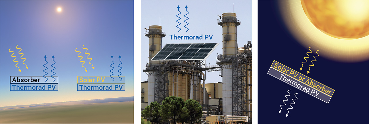 Left: Daytime configurations that (left) exploit solar absorption to increase the temperature of the thermoradiative device and (right) couple the device with a solar photovoltaic to generate power from both the sun’s radiation and its own radiative emission. [Space Engine image of Earth. P. Hacks; CC BY 4.0] Center: Thermoradiative devices could be used to convert waste heat to electricity. [Natural gas power plant. L.D. Moore; CC BY 4.0] Right: Operation in space, where the lack of atmospheric interference increases the performance of both thermoradiative and solar photovoltaic devices. [Sakurra / Getty Images]