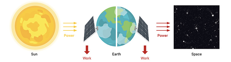 Work can be extracted from a heat engine as energy flows from a hot body to a cold body. For example, as energy flows from the sun to Earth, a photovoltaic solar cell can extract power in the form of electricity. Similarly, a thermoradiative cell can extract power from “hot” Earth as energy is radiated toward cold space.