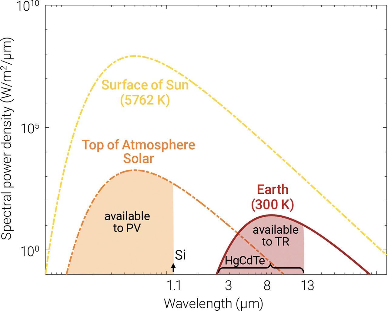 [Enlarge image]The spectral power density available from the sun and Earth. Because they occupy different portions of the electromagnetic spectrum, different semiconductors are needed to effectively use their spectral emission.