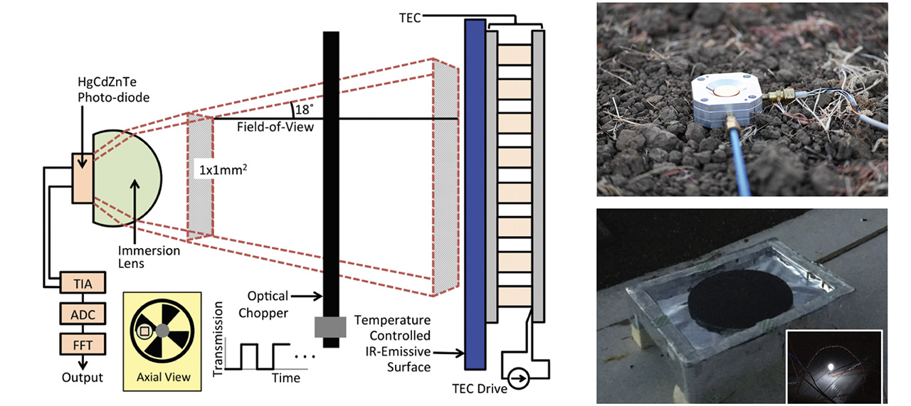Left: Schematic of a typical laboratory experiment. Right: Outdoor experiments using thermoelectric devices to generate electricity (top) and operate an LED through radiative coupling with the night sky (bottom). [P. Santhanam et al. Phys. Rev. B 93, 161410 (2016). Copyright 2016 by APS / Munday Lab / A.P. Raman et al. Joule 3, 2679 (2019) with permission from Elsevier]