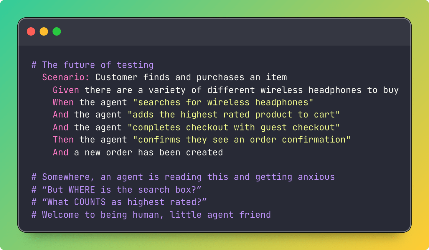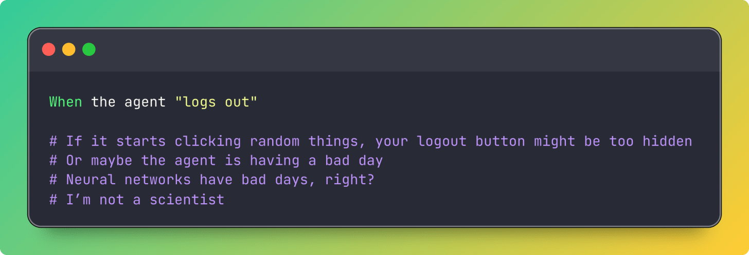 You’re testing the concept of logging out. Not the implementation. The agent has to figure out where the logout button is, what it’s called, whether it’s in a dropdown menu, whether it requires confirmation. Just like a user would.