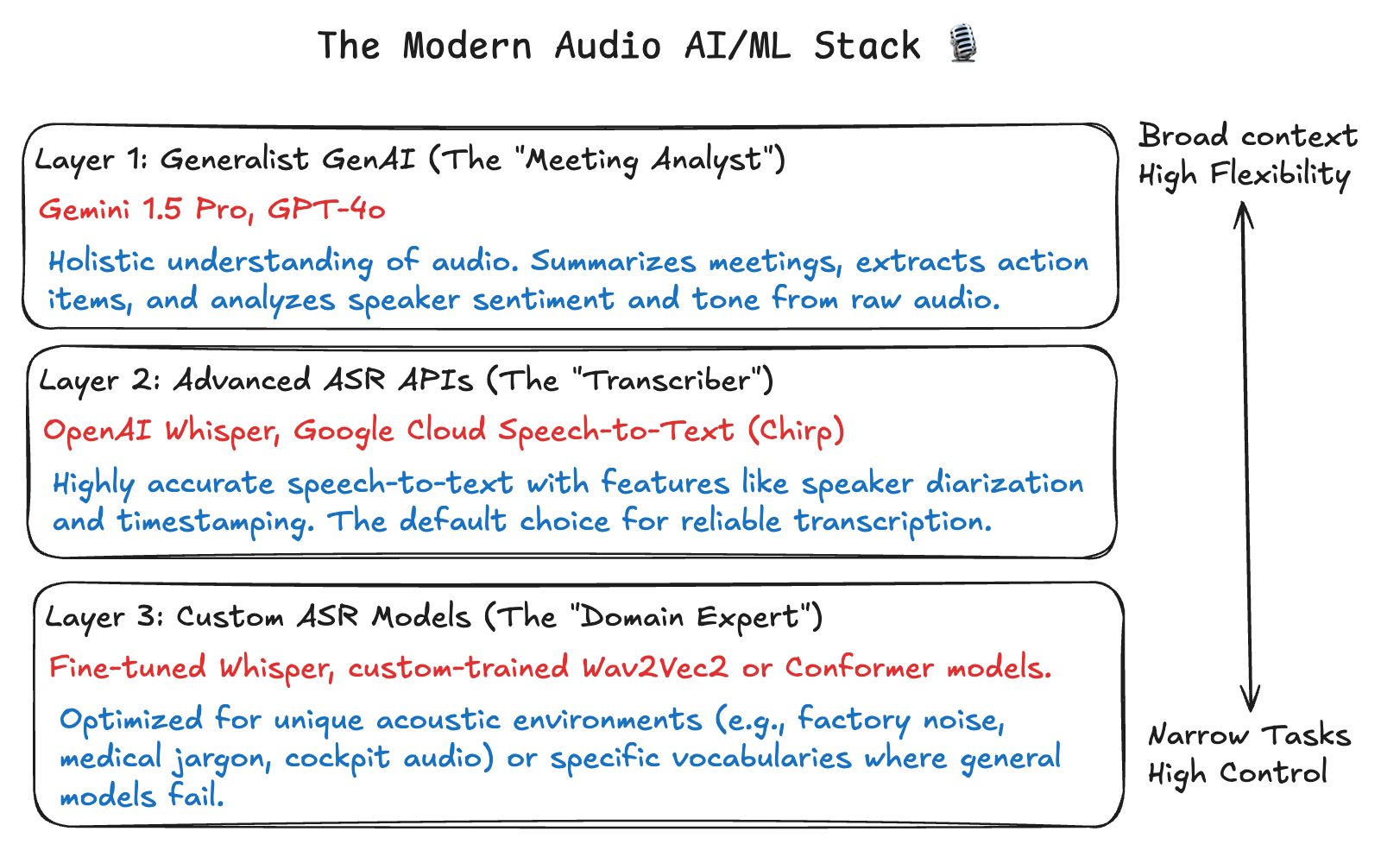 For Audio: Need to transcribe and analyze support calls? You’d architect a custom speech-to-text model from scratch, train it on massive audio datasets, and still struggle with unique accents and domain-specific jargon.