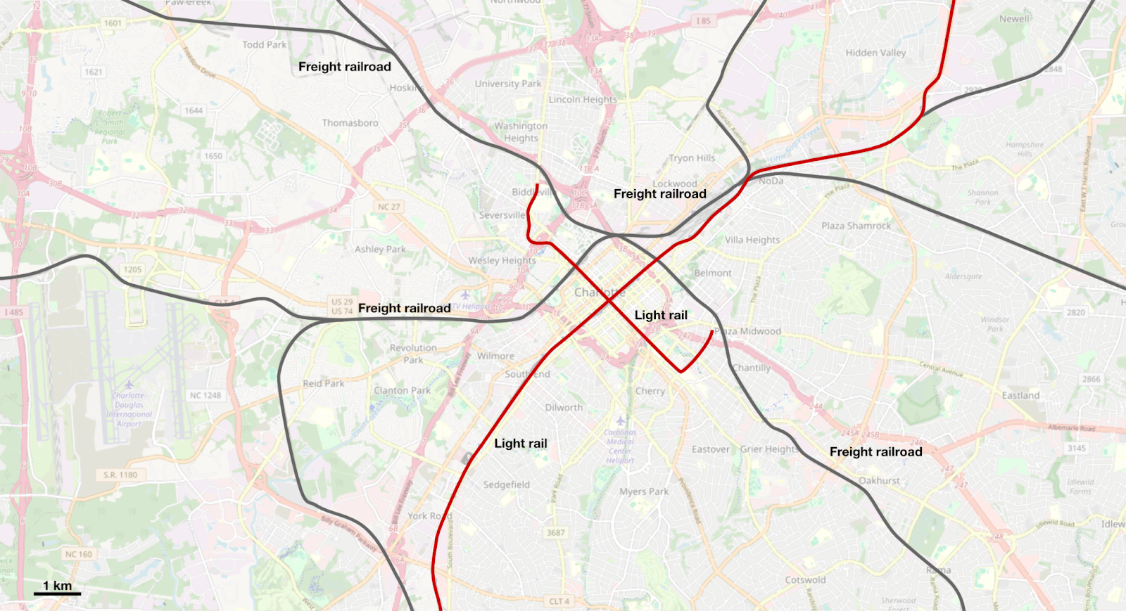 The biggest opportunity, however, is perhaps in North America. Take Charlotte, North Carolina. The American model of huge low-density suburbs means Charlotte only has 380,000 people within ten kilometers of its center, even though its urban area overall has 1.4 million people, similar to Munich’s. The low density of Charlotte means a transport network like Munich’s is not viable, but the city could take its pre-existing light rail network and join it up to the extensive network of railroad lines around the city that are currently used only for moving freight.
