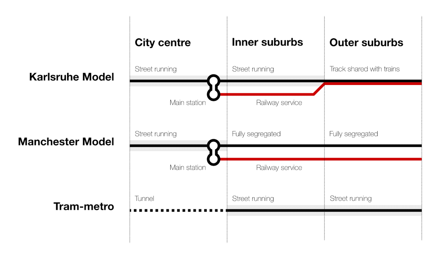 Another model is the ‘tram-metro’. This is common in medium-sized German cities like Düsseldorf. It involves trams that run on the streets in the suburbs of the city, and then go into a tunnel under the city center. Although this is more expensive than running on streets, tunneled trains are never held up by traffic in the center.