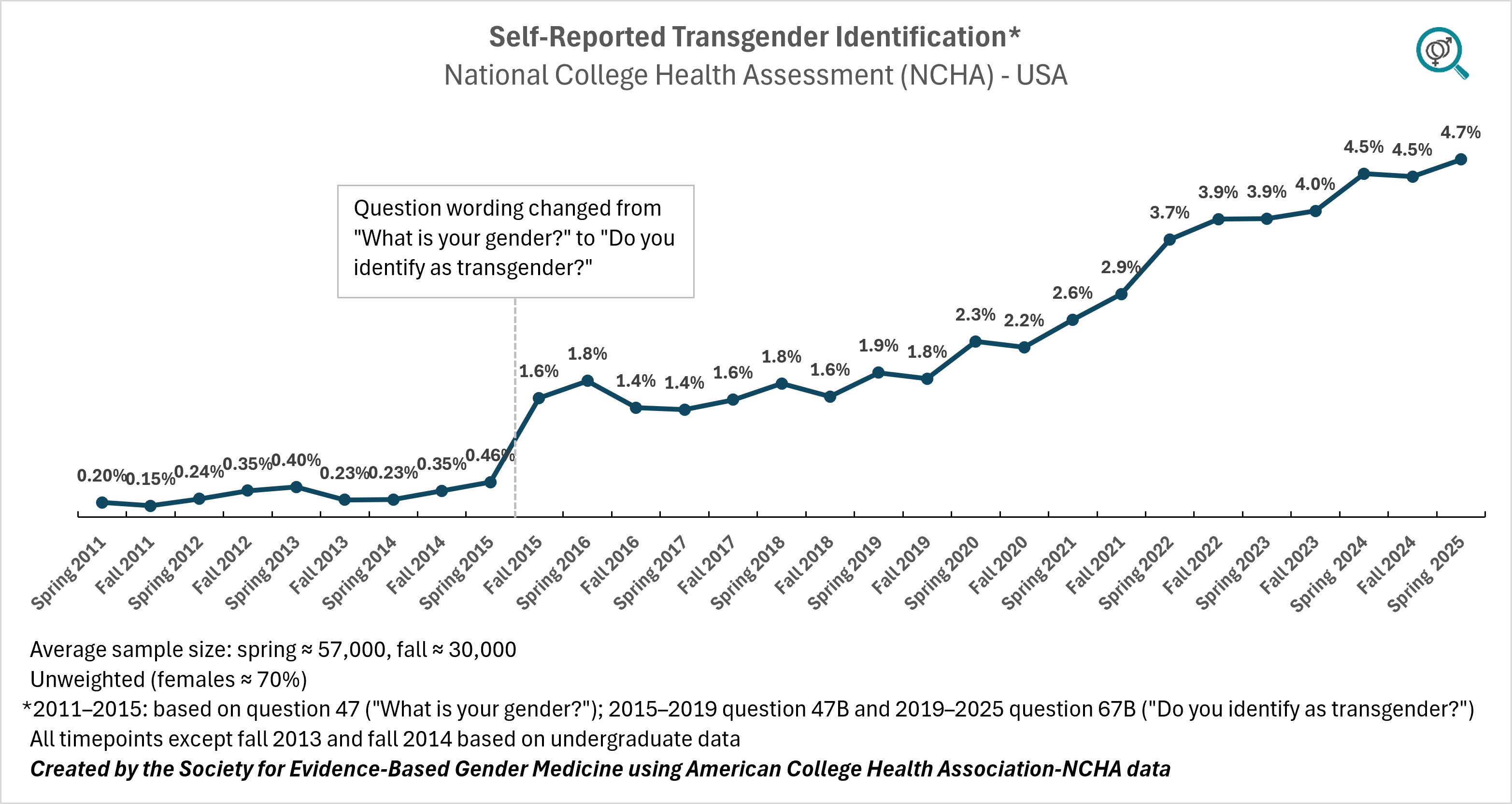 According to the data published by the American College Health Association's National College Health Assessment, the proportion of students self-reporting a “transgender” identity has risen steadily, reaching 4.7% (almost 1 in 20) as of spring 2025 (see Figure 1).