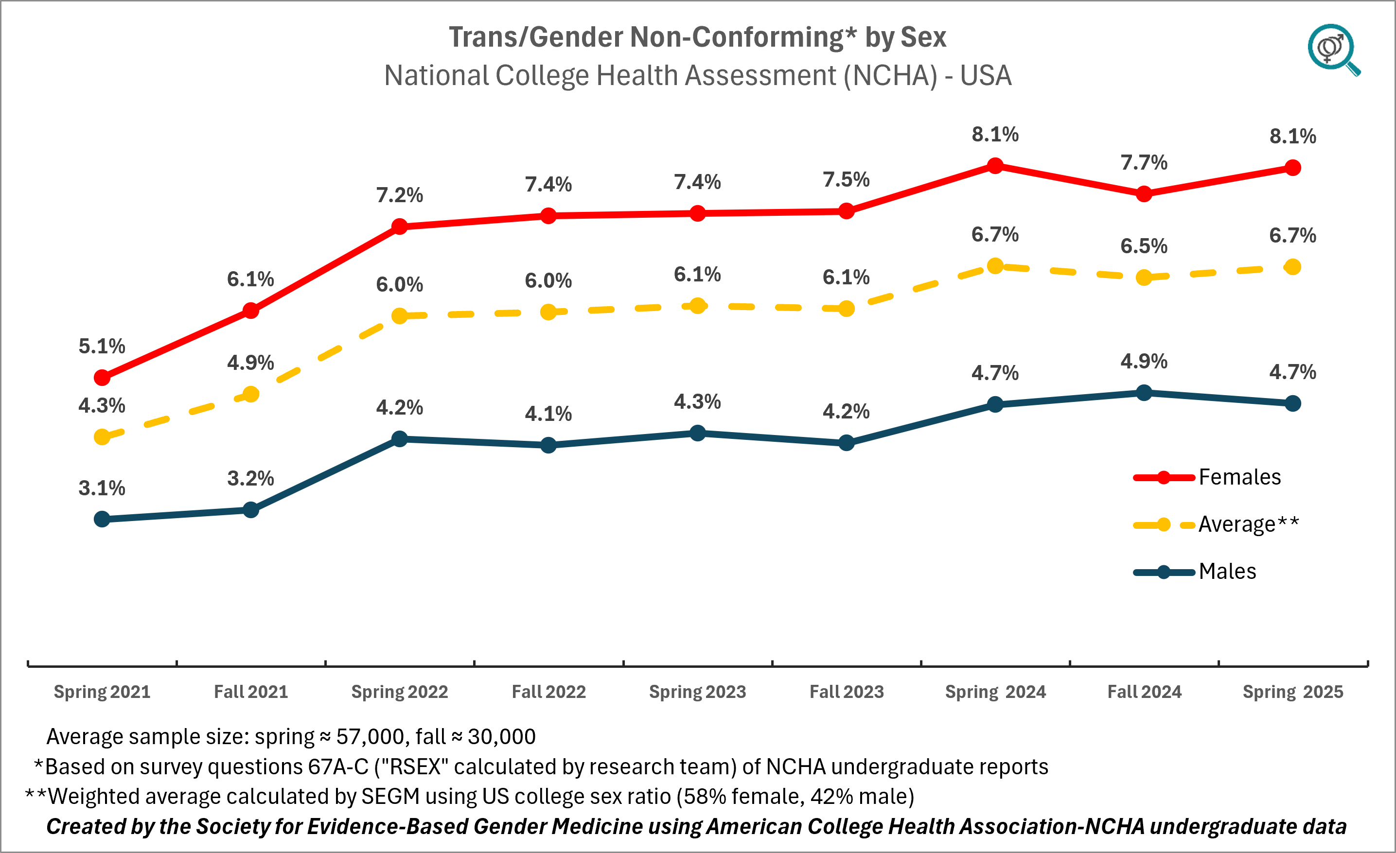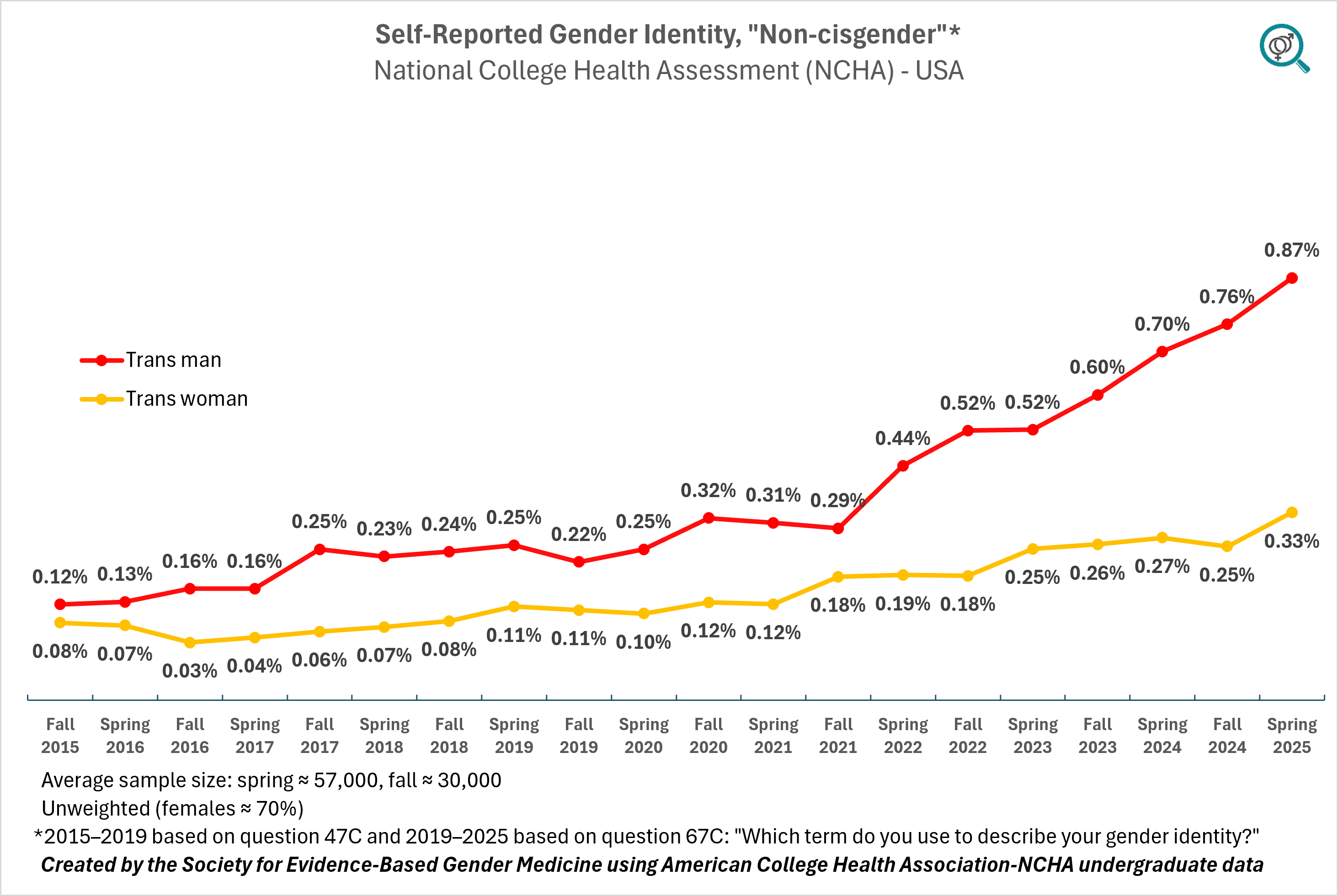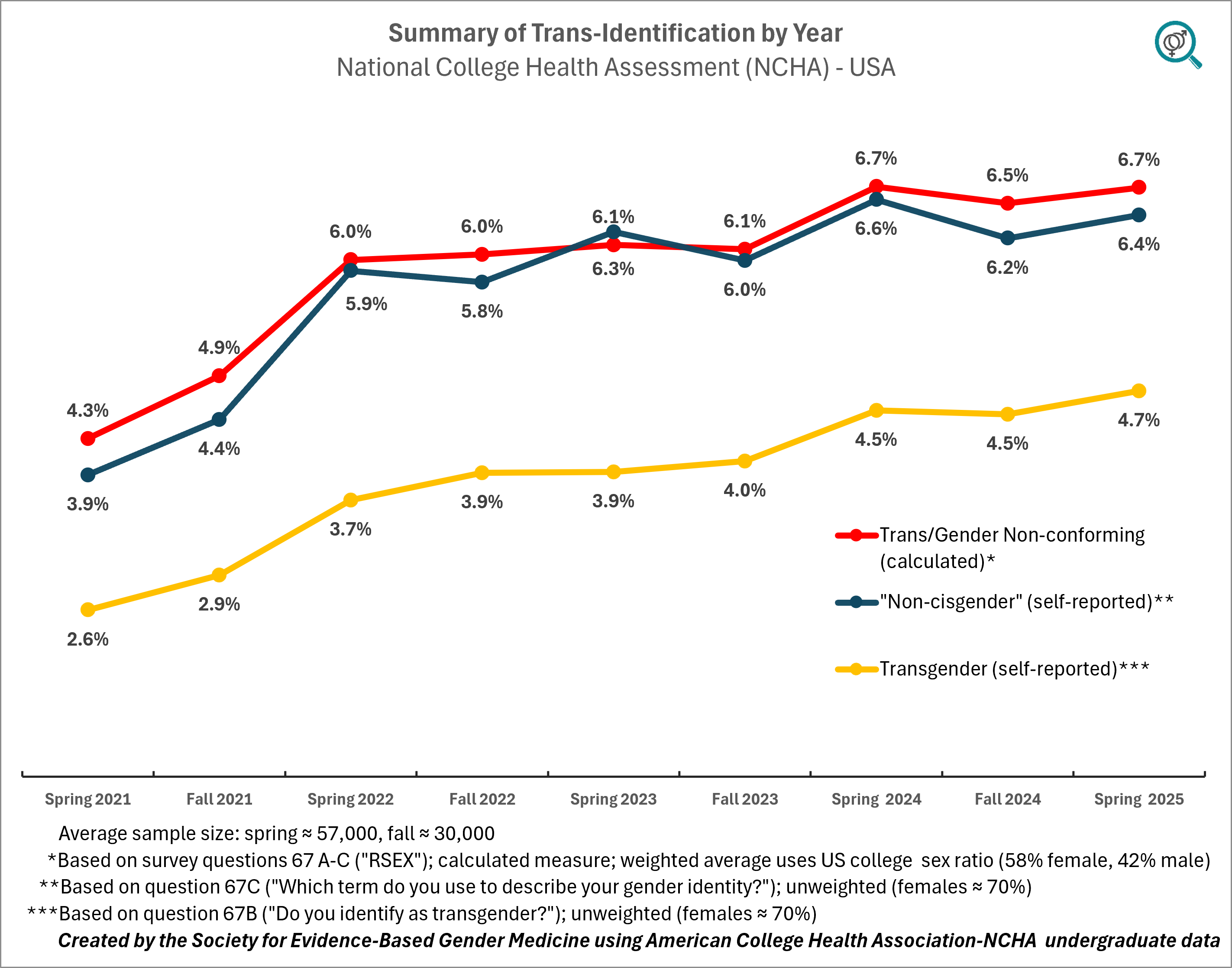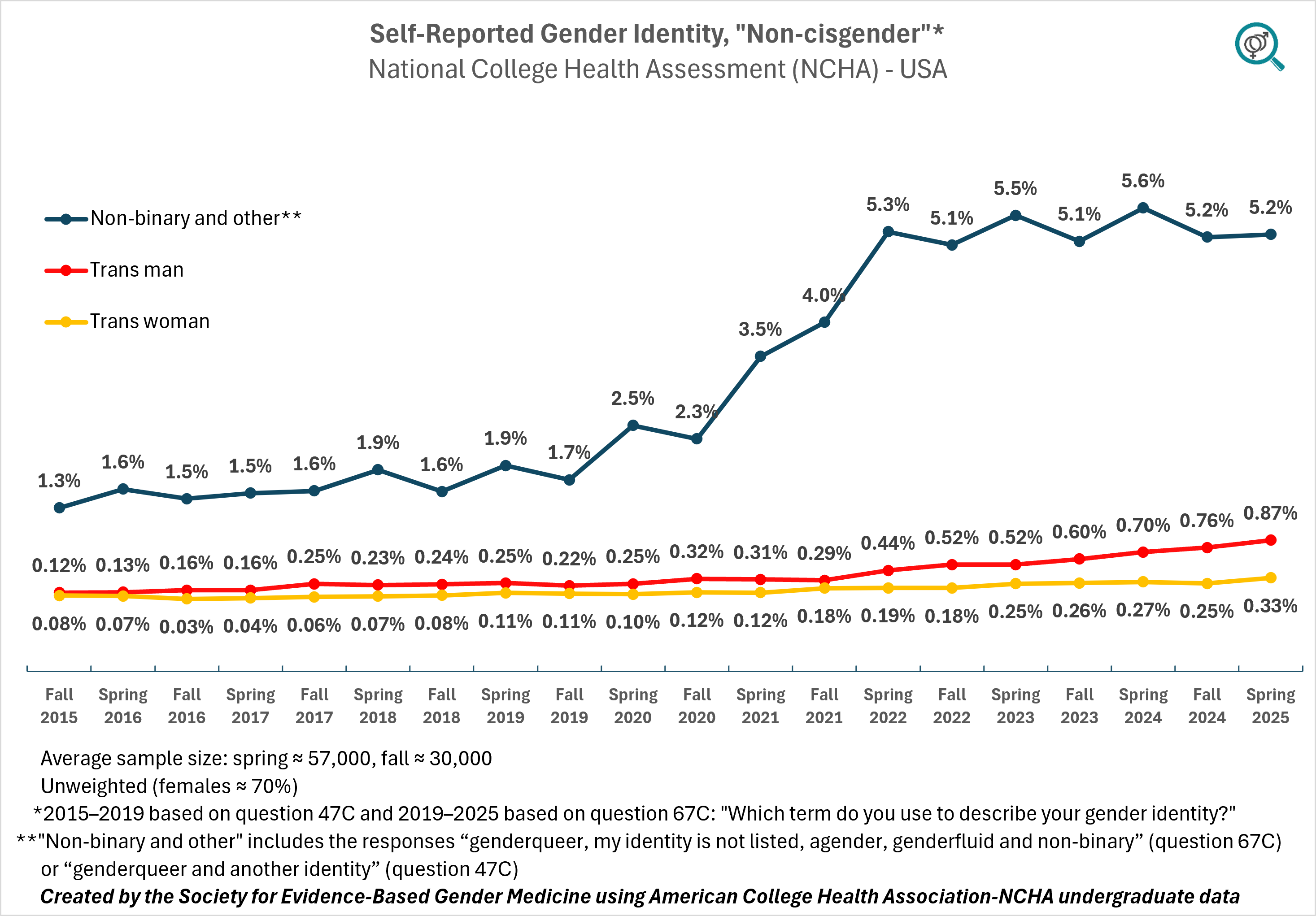 This is the only gender identity-related variable the researchers made available by sex, thus we were able to calculate the weighted average using sex ratios in U.S. college population. It was not a major adjustment since, while in raw data, about 70% of respondents were female, the population percentage is closer to 60%. The final weighted number by sex indicates that in 2025, the rate of U.S. undergraduate college student "non-cisgender" identification is at 6.7% (95% CI: 6.5%–6.9%).